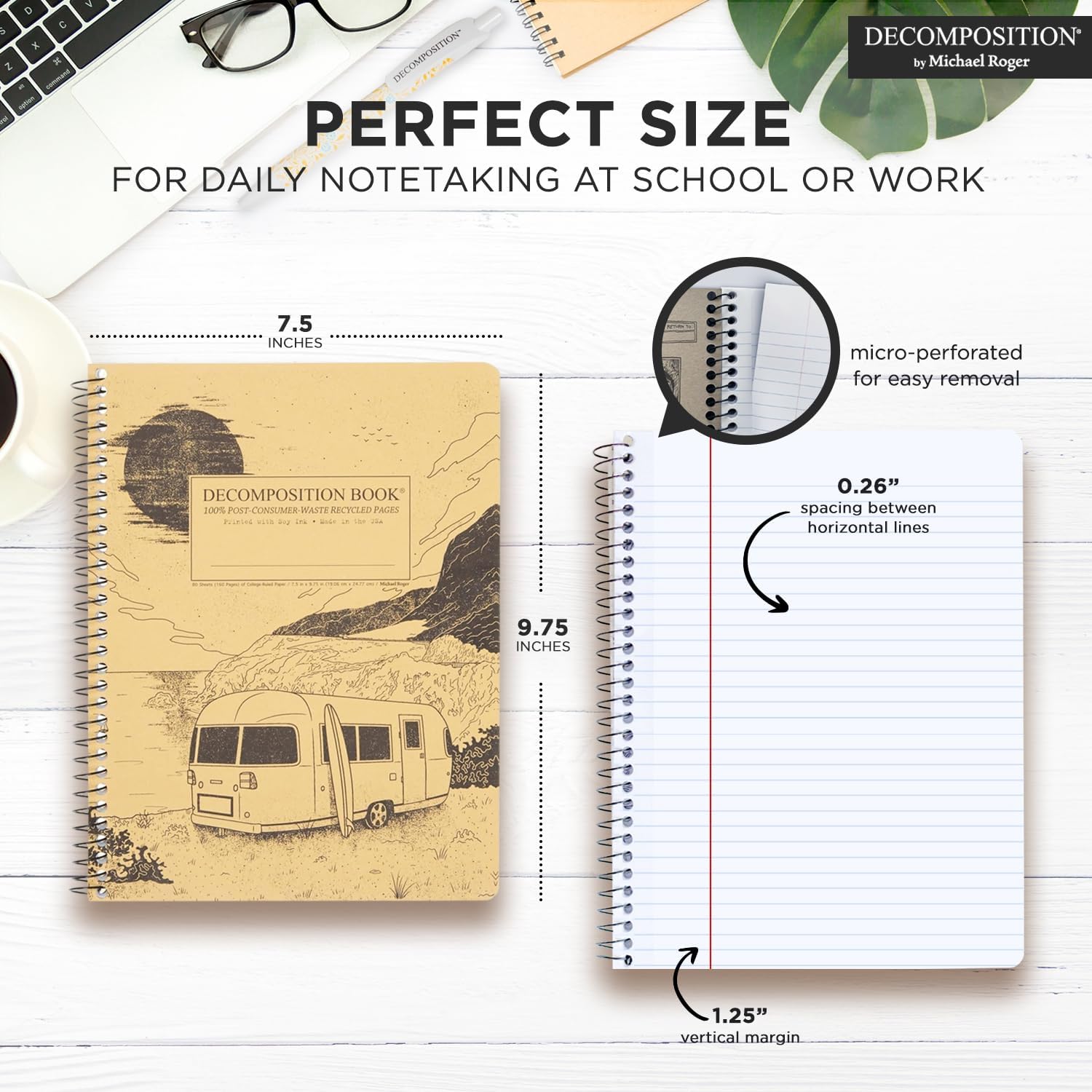 - Decomposition Books are the the perfect size for daily notetaking at school or work and are suitable for sketching, drawing, journaling, recipe-writing and more! They are compact enough to fit in a backpack but large enough to accommodate all your writing needs. Decomposition Books make an ideal choice for students, professionals and hobbyists alike.