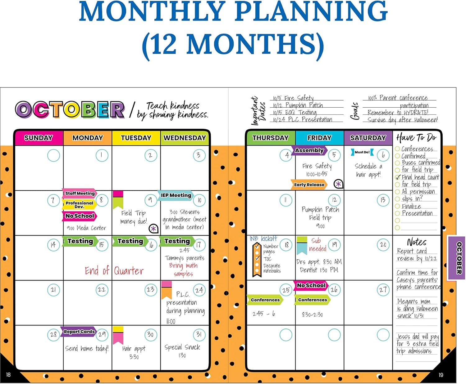 - Goal-Setting Success: Set your goals in the yearly and monthly spreads, then record steps for completion in the weekly sections. Set substitute teachers up for success with important class information and goals in the substitute information section.