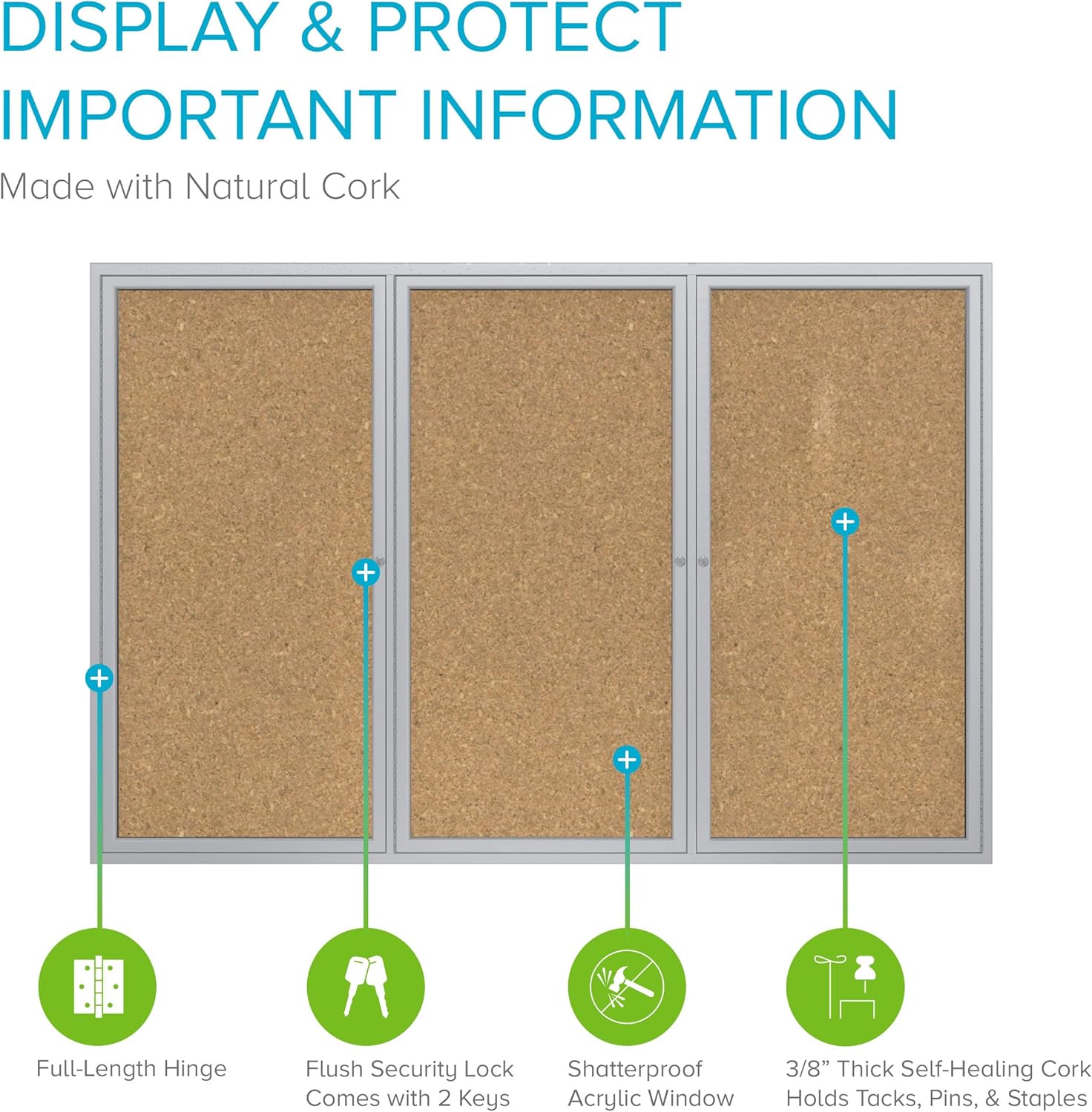 Ghent 36" x 72" 3-Door Indoor Enclosed Bulletin Board with Lock, Cork Material, Shatter Resistant Acrylic Panels, Made in the USA, Satin Aluminum Frame