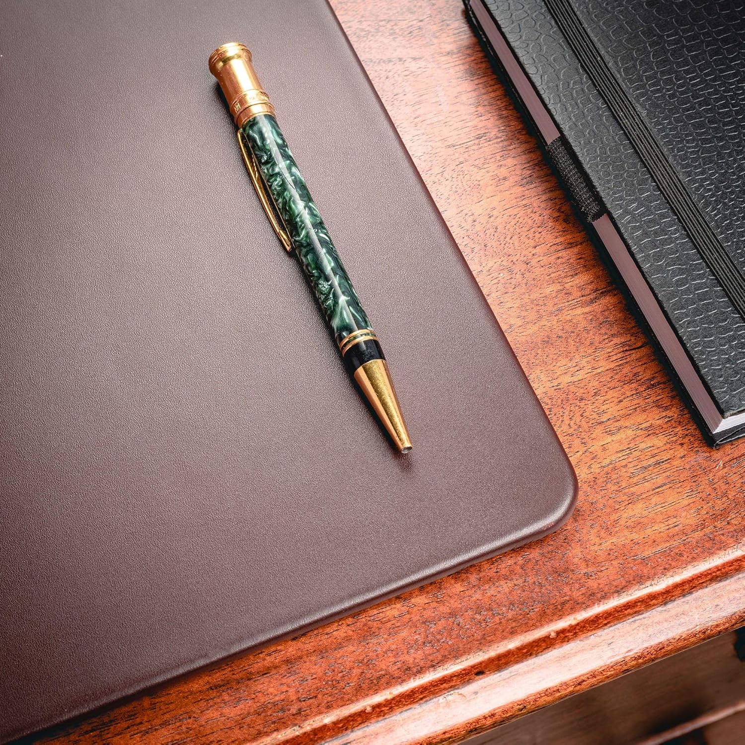 - LUXURY ADDITION TO THE OFFICE SETTINGS: Give your desk some personality with this great top-grain leather pad! Featuring a clean, open work space and luxurious writing surface, this chocolate brown leather desk pad enhances both form and function in your office. Built with a rigid internal core and gentle felt backing, this durable 38"x24" desk pad adds a buffer between your expensive furniture and the marks and scratches of daily use. The sleek, rail-less design is elegant and classic, and the rich chocolate brown color adds warmth to any office setting.