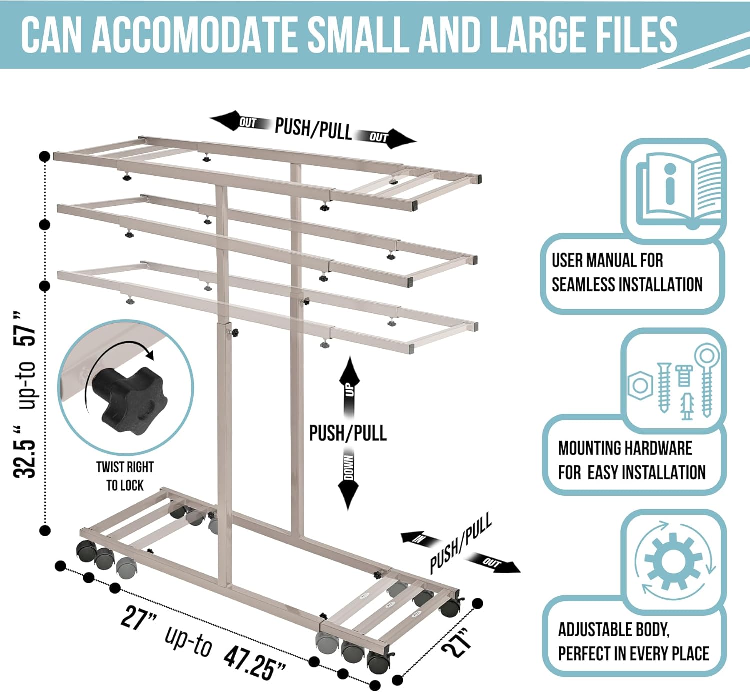 - Portable and Adjustable: The Adir blue print hanging clamps organizers are transportable with ease. The architectural plan storage comes equipped with brakes to ensure stability. What sets our architect drawing holders apart is their height and depth adjustability, catering to individuals of various heights and effectively storing both smaller and larger files.
