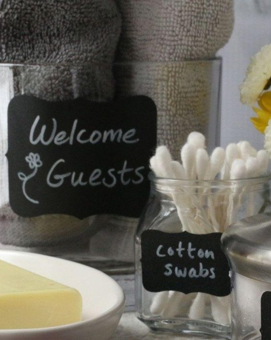 - ⬛ CLASSIC STYLE Cestari fancy chalk labels add a classic look to your home in the kitchen, bath, craft center, toy room, and more, as well as add flair to party and wedding favors and decorations. Cestari Labels lend the appearance of blackboards, with the convenience and ease of stickers that can be erased and reused.