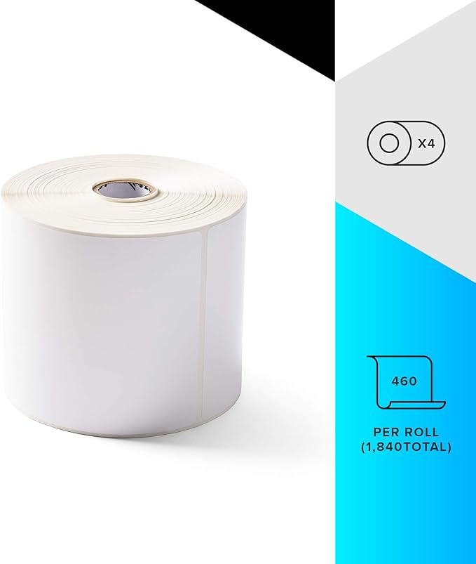 - Full length rolls: 4 x 6 in; 1 in core; 5 in roll diameter; 460 labels per roll; 4 rolls; 1,840 total labels