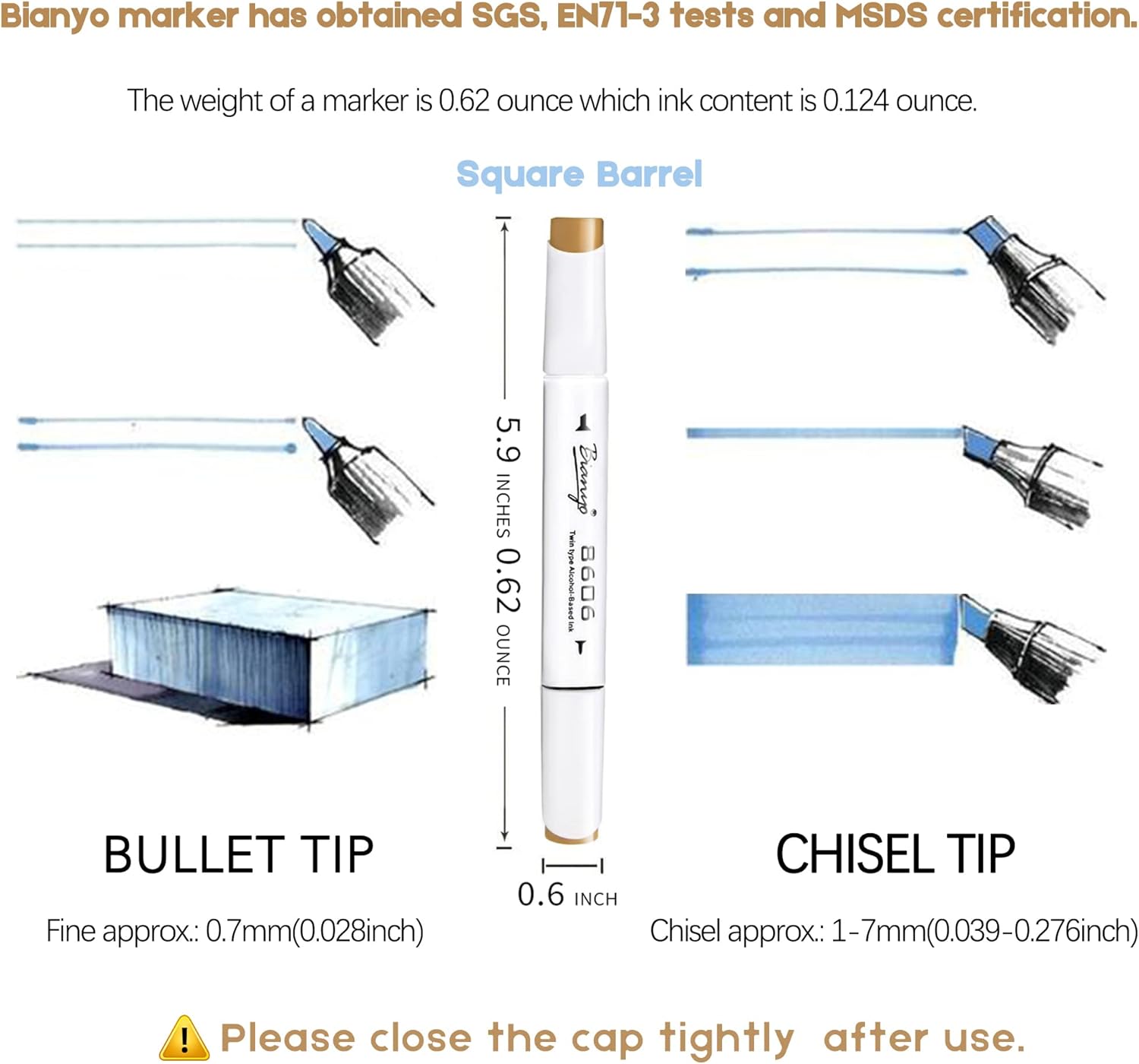 - Certified Safe & Alcohol-Based Ink: Bianyo markers feature alcohol-based, low-odor ink that is SGS, EN71-3, and MSDS certified for safety. The durable chisel tip covers 328 feet, while the bullet tip reaches up to 1738 feet, offering reliable performance for any artist
