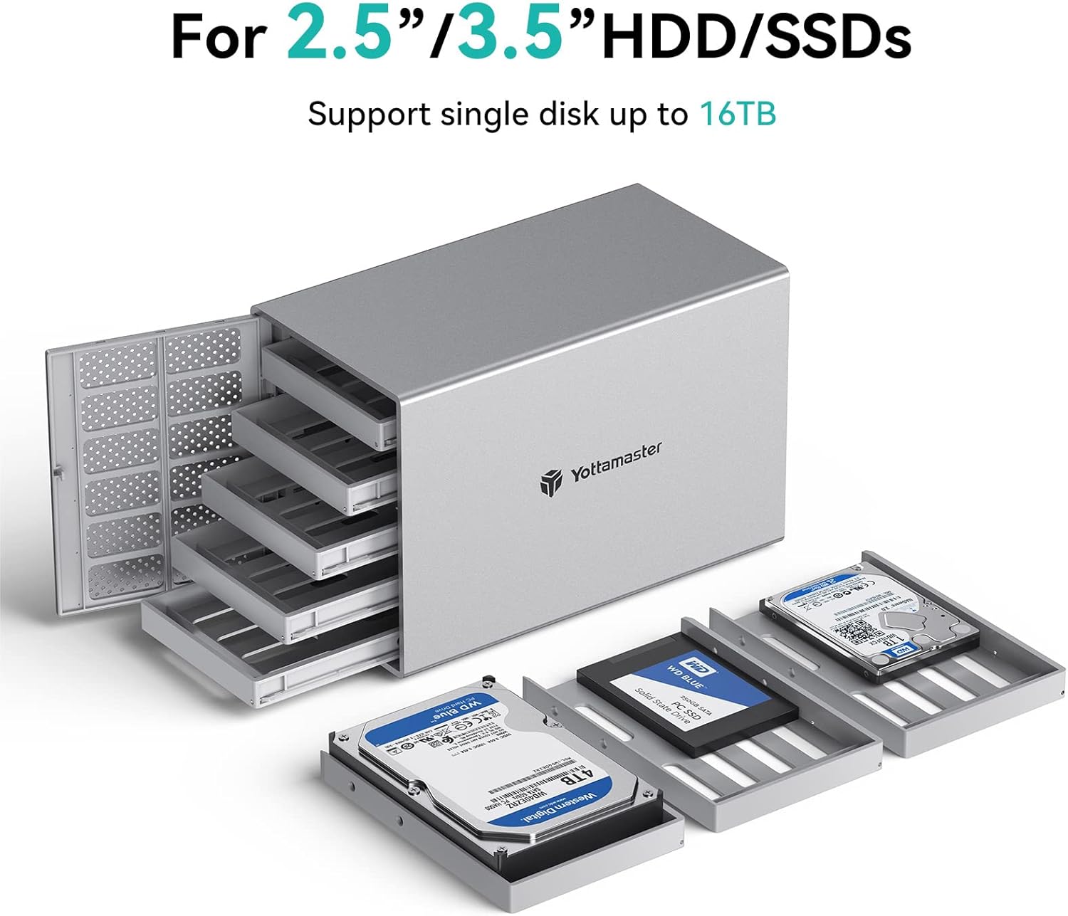 - 【For 2.5”/3.5” SATA Hard Drive】The 5 bay hard drive enclosure is designed for 2.5”/3.5” SATA HDD or SSDs. Yottamaster aluminum sata hdd enclosure features with 5 removable trays, allowing for easy installation and replacement of either the large desktop hard disk drives or the portable laptop drives and SSD's.