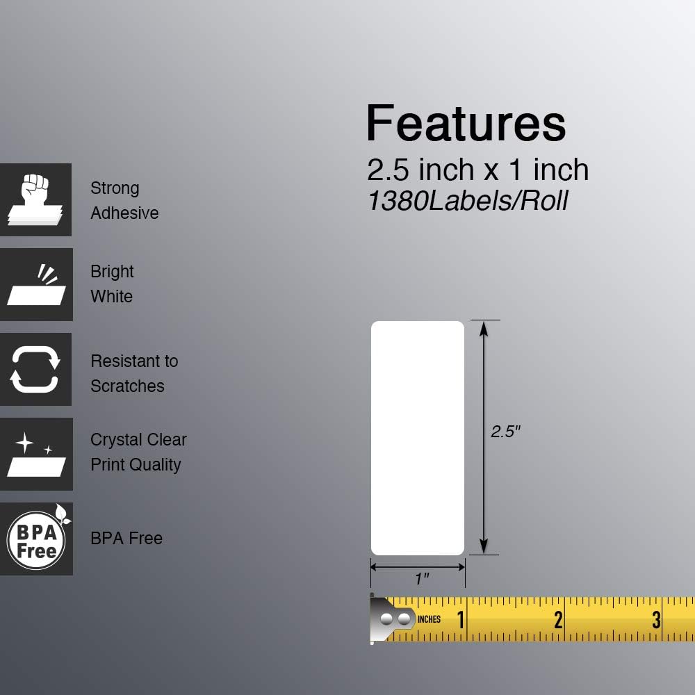 - [ Specifications ]: 2.5 in x 1 in (64 mm x 25 mm) (1380 Labels/Roll, 2 Rolls),Paper tube diameter:1"(25.4mm). No Ink Toner or Ribbons Needed! Save your money and effort.