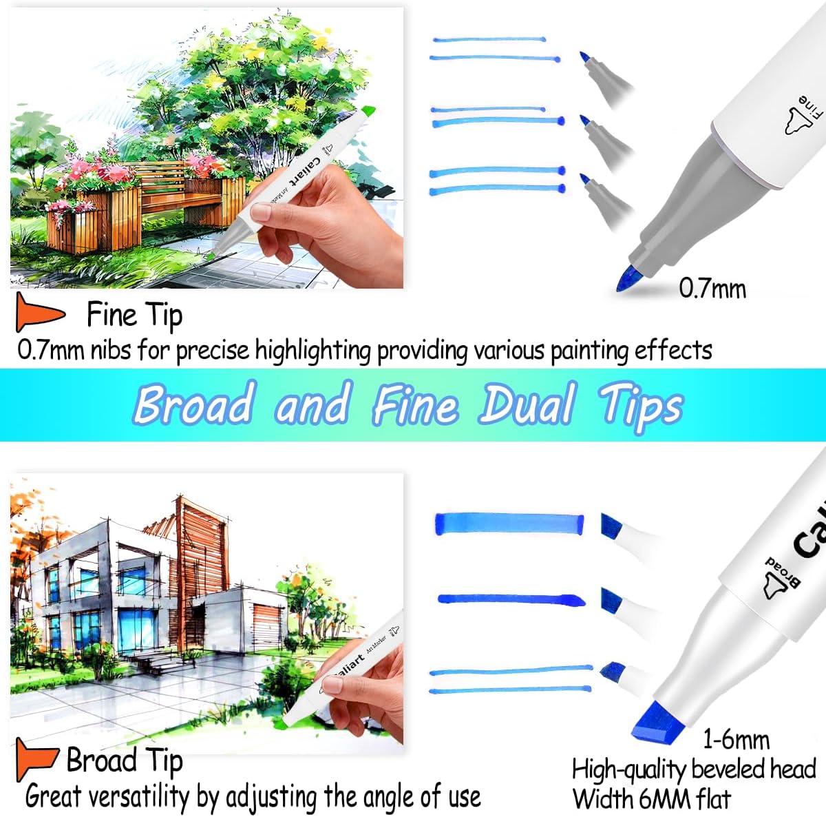 - 🎨 Dual Tips & Round Pen holder - Broad chisel (approx. 1-7mm) and fine point(approx. 0. 7mm) nibs for precise highlighting and underlining. Allowing you to write in both thin and thick lines, providing great versatility. Caliart artist markers are great for providing various styles, sketches and patterns with ease. NOTE: as they are Alcohol Based Markers like ALL other brand alcohol markers, they will Bleed through regular coloring paper, except very thick paper, marker paper.