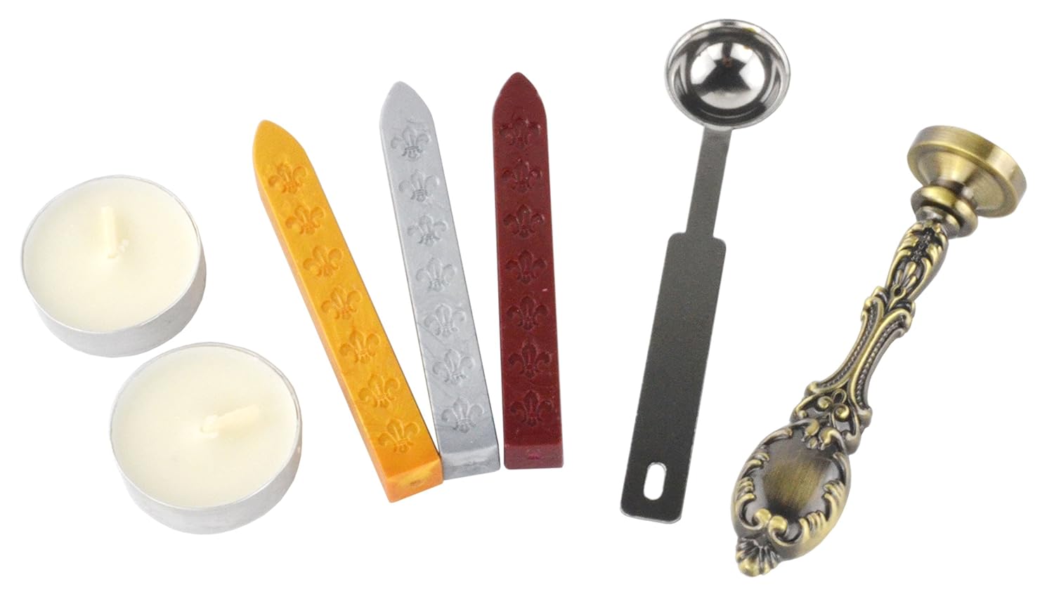 - Creative Box -- An old mysterious book style packing contains 1pc * Wax Stamp, 1pc* Wax Spoon, 2pc*white Wax,3pc* Sealing Wax Stick(Gold, Silver, Dark Red)