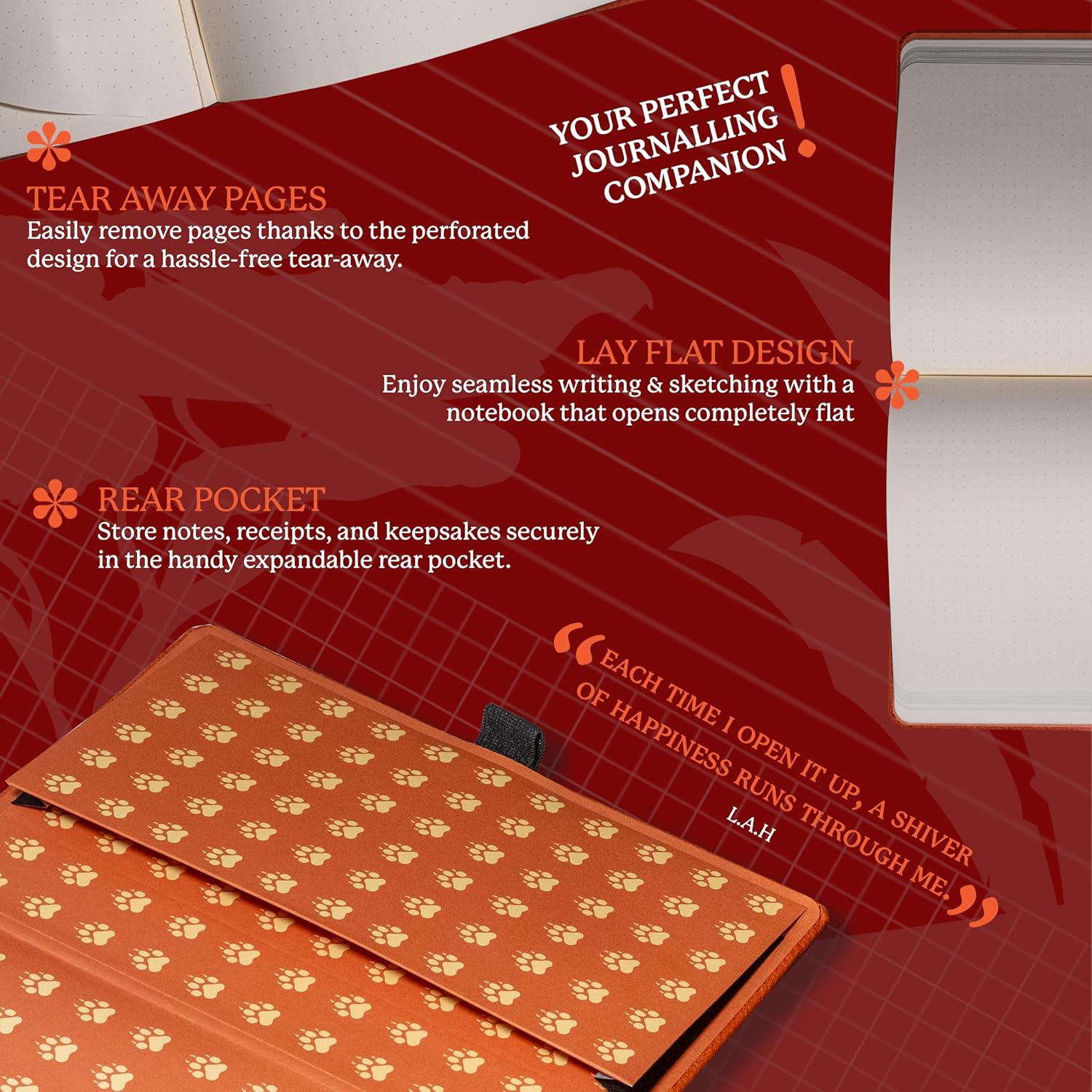 - HIGHEST-QUALITY WRITING PAPER: Dingbats Orange Tiger Medium A5 Notebook Journal has 192 pages-96 sheets of no bleed, smooth writing, Cream 100gsm, acid-free fountain-pen friendly, perforated plain paper in a flat lay design