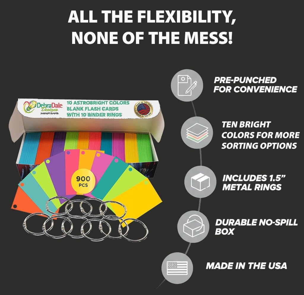 Debra Dale Designs Flash Cards – Blank Color Coded Index Cards for Visual Learners, Pre-Punched with Metal Rings, Durable Multicolor Cardstock for Memorization, School & Organization