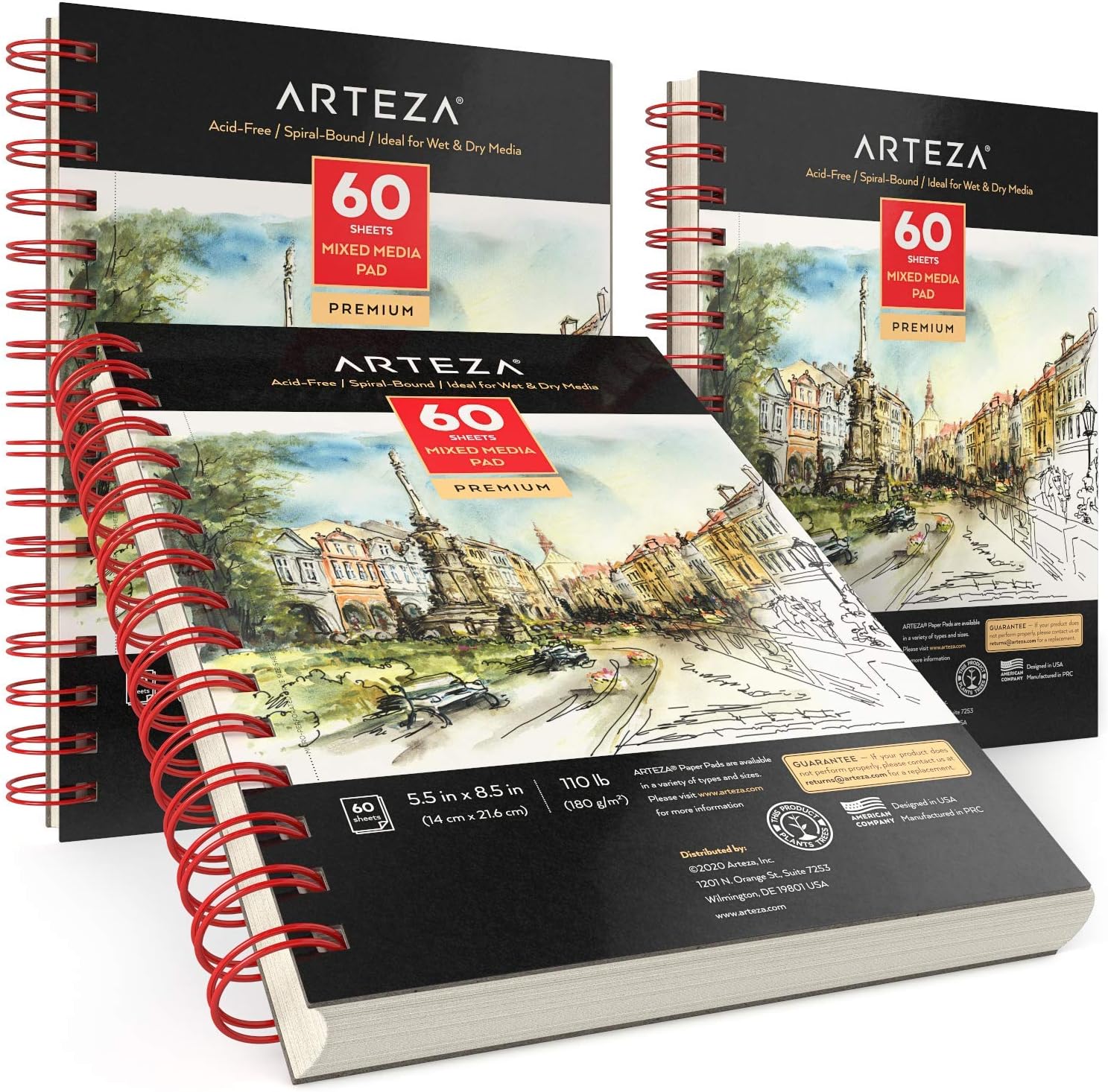 ARTEZA Mixed Media Sketchbook, 5.5 x 8.5 Inches, Pack of 3, 60 Sheets Each, Micro-Perforated Spiral-Bound Paper Pad for Wet and Dry Media