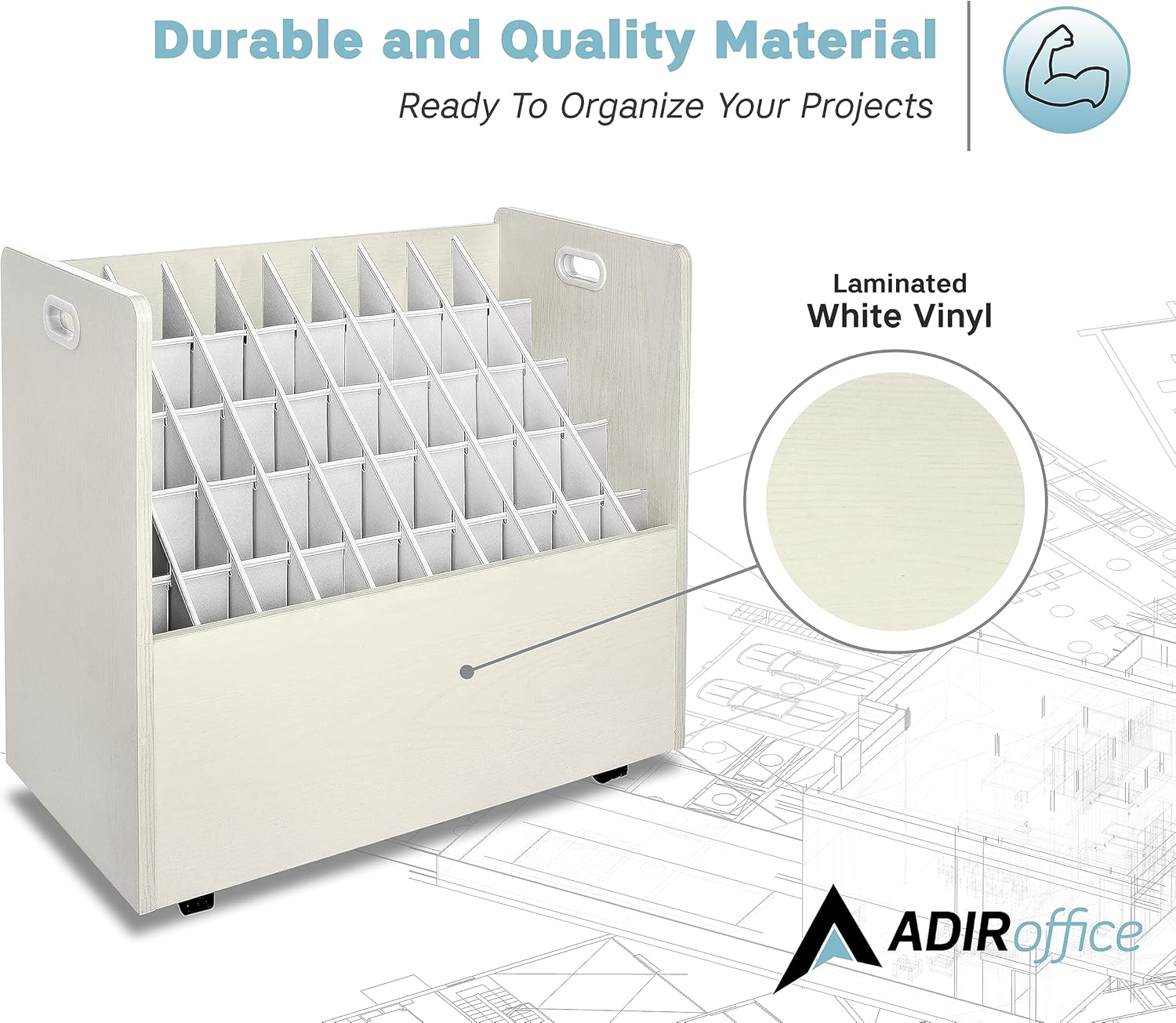 - Stylish and functional: The Adir’s plans organizer combines aesthetic appeal with practical design. Its sleek vinyl laminate finish complements any decor. With a 50-pound weight capacity and sturdy construction, this rolled document storage is built to last.