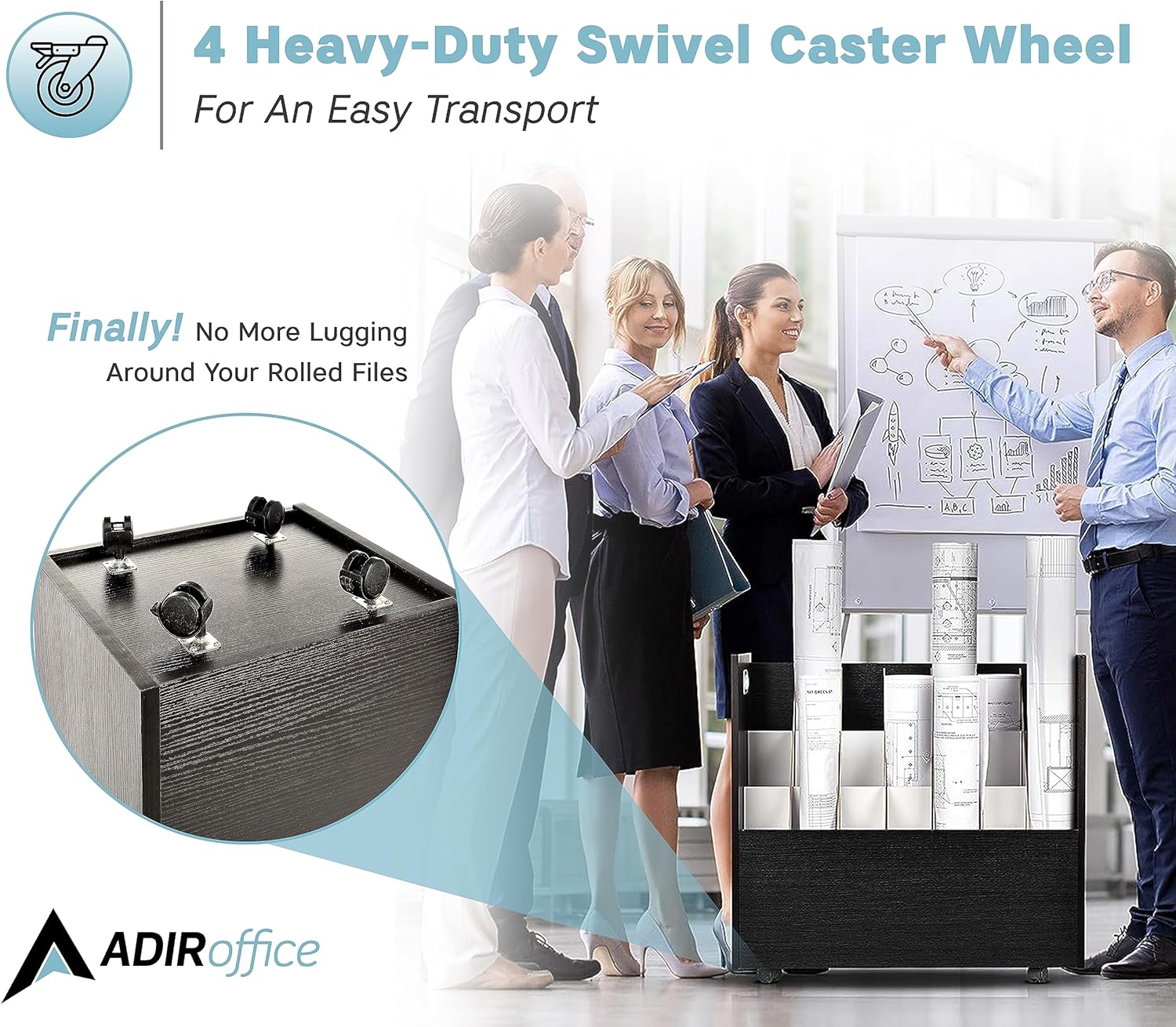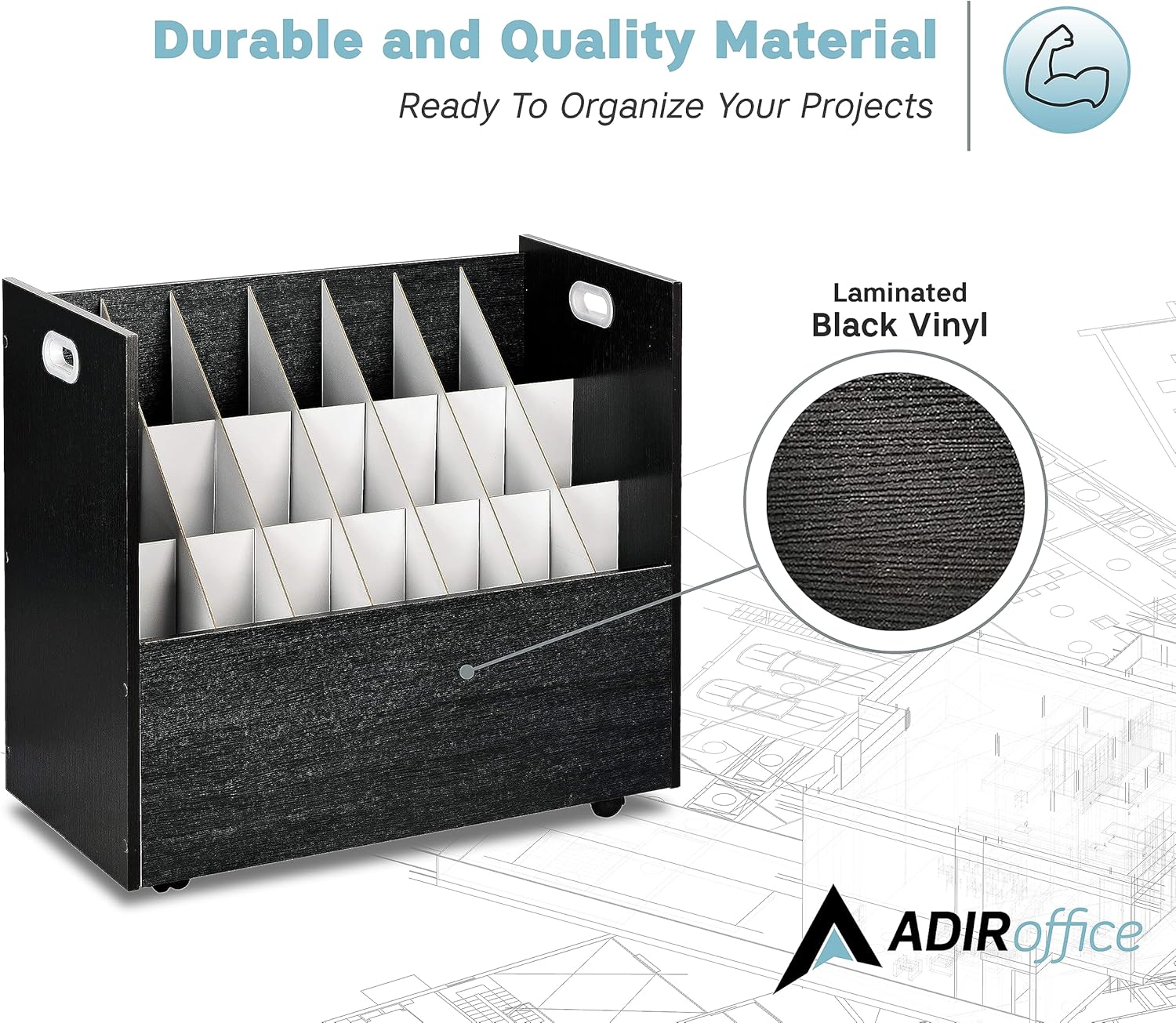 Adir Blue Print Storage Organizer - Mobile Roll File Cart, Construction Plan Holders, Blueprint Cabinet with Wheels, Roll Files Storage for Office and Home (21 Slots, Black)