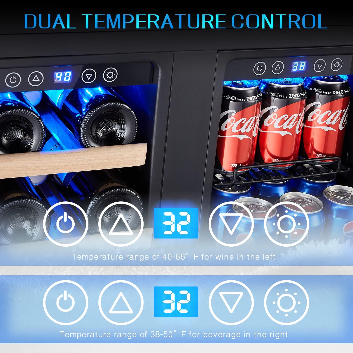 - INDENPENDENT TOUCH CONTROL: Bace on digital temperature control, our beverage cooler offers a temperature range of 40-66°F for wine in the left and a range of 38-50°F for beverage in the right.