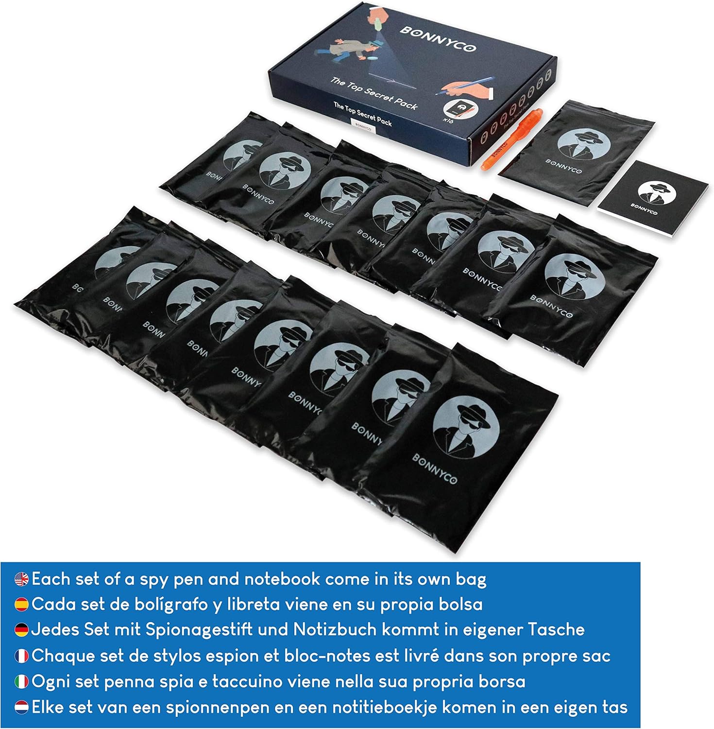 - 🕵 PACK x 16 SPIES 🕵 Our Top Secret Pack spies includes 16 sets of 1 x 5.11 in invisible ink pen with UV light (batteries included) and a small notepad. There are a total of 16 magic pens with 8 different color casing: red (x2), yellow (x2), orange (x2), green (x2), blue (x2), pink (x2), violet (x2) and fuchsia (x2). The transparent ink is the same color for all
