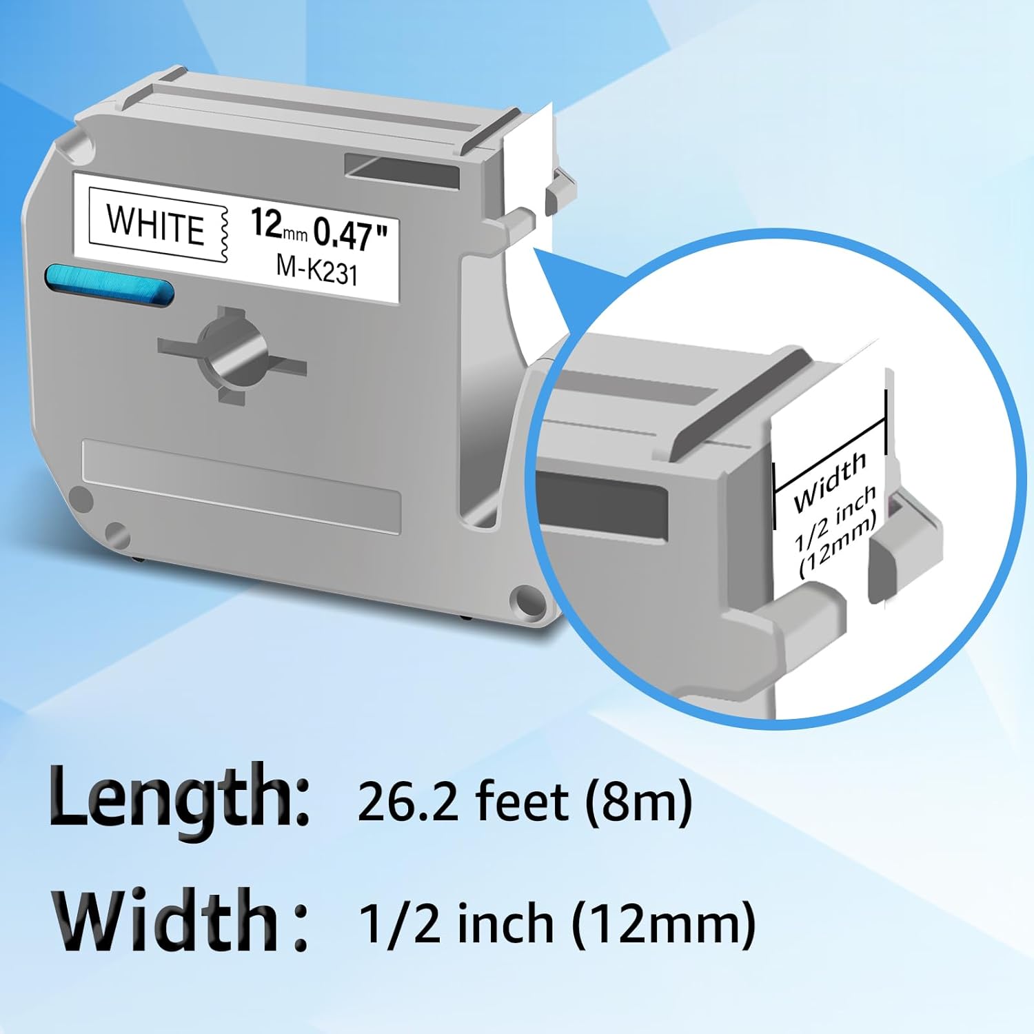- Package includes: 1 pack compatible for brother p-touch mk231 m231 m-k231 m-k231s non-laminated label maker tape. Color: black ink on white tape. Width: 1/2 inch (12mm), length: 26.2 feet (8m).