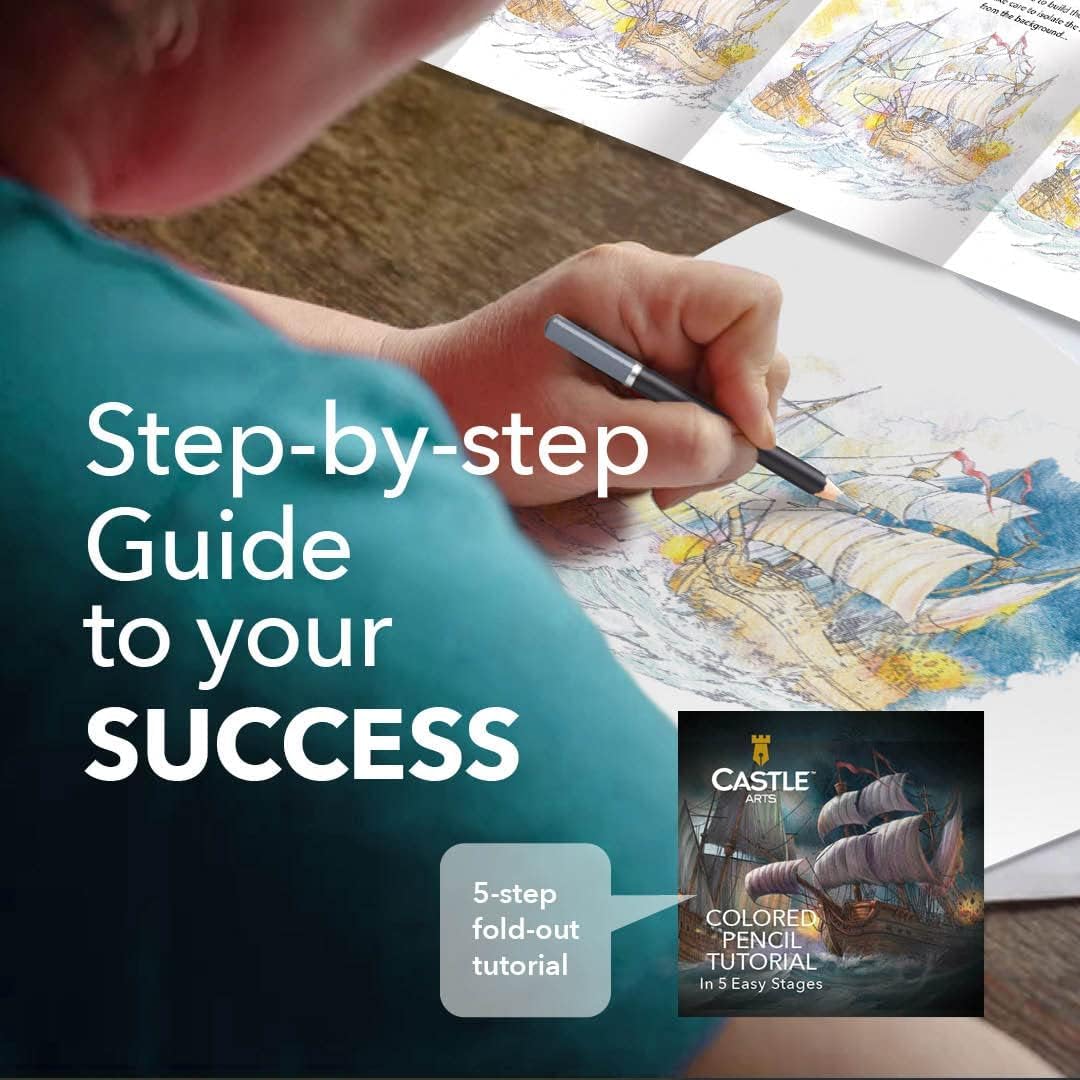 - BUILD YOUR SKILLS Unique fold-out tutorial enables you refine your colored pencil skills by re-creating the stunning galleon illustration on the sleeve cover.