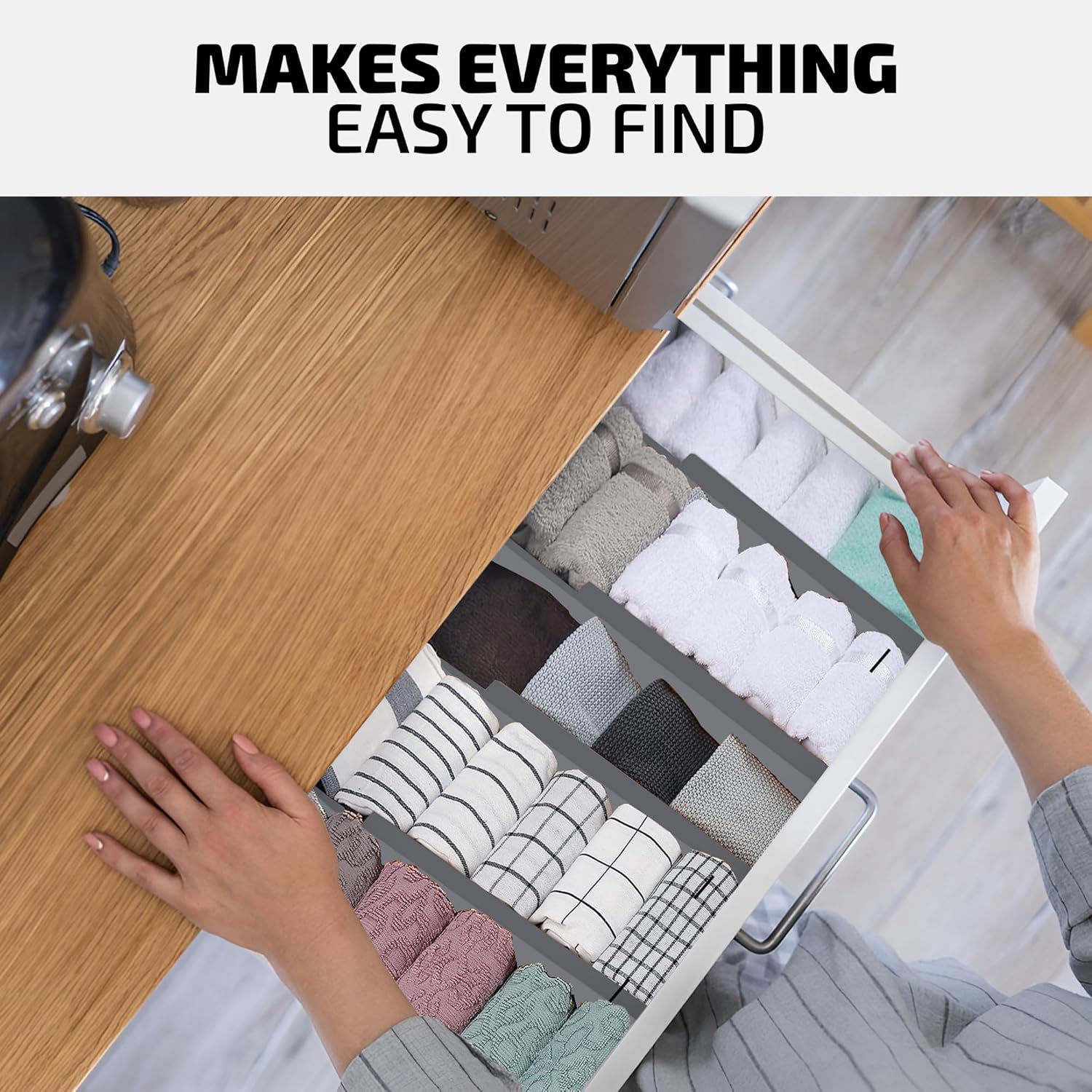 - ✅ EASY & SECURE INSTALLATION: Quickly install these gray dividers without the need for tools. The strong, spring-loaded mechanism ensures they remain firmly in place, even with daily use. Additionally, the EVA foam at each end prevents slipping and protects your drawers from scratches or pressure damage, ensuring both stability and safety.