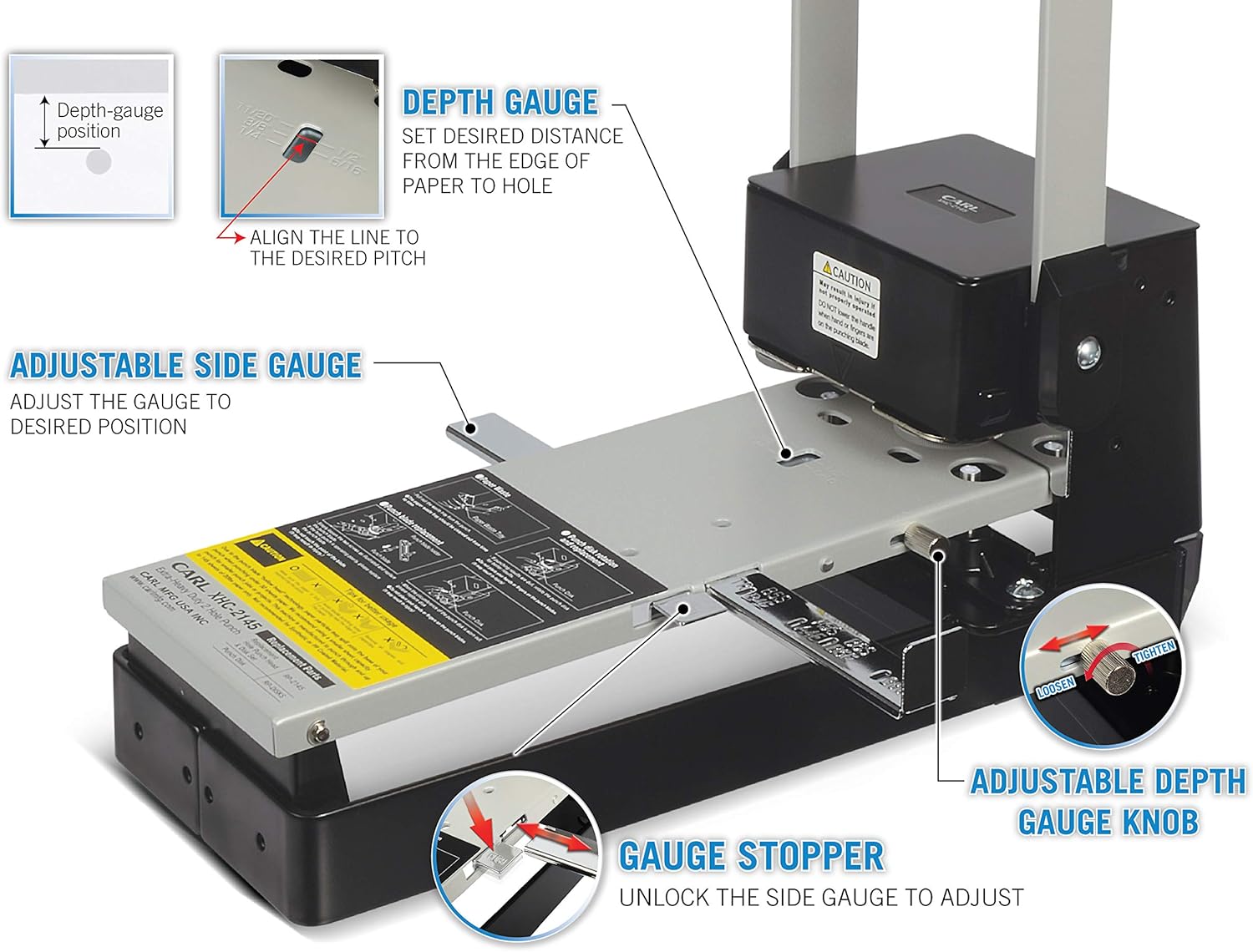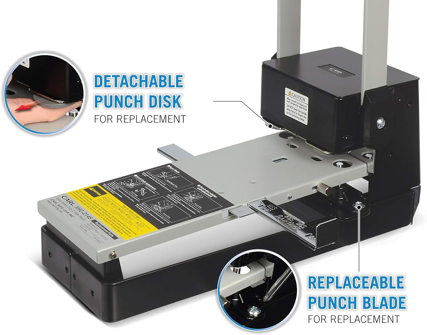 CARL, XHC-2145, Heavy Duty 2-Hole Punch – 145 Sheet Capacity Paper Puncher with Precise Spacing, Built-in Waste Bin, Fits US & Metric Brooch Sizes – Office, School & Binder-Ready Use.