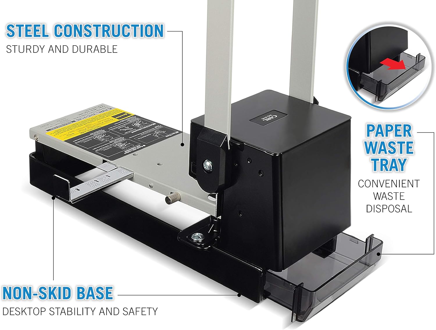- WASTE STORAGE BOX KEEPS DESKS CLEAN – Say goodbye to paper mess—our hidden waste bin stores punched scraps so your workspace stays organized, professional, and clutter-free.