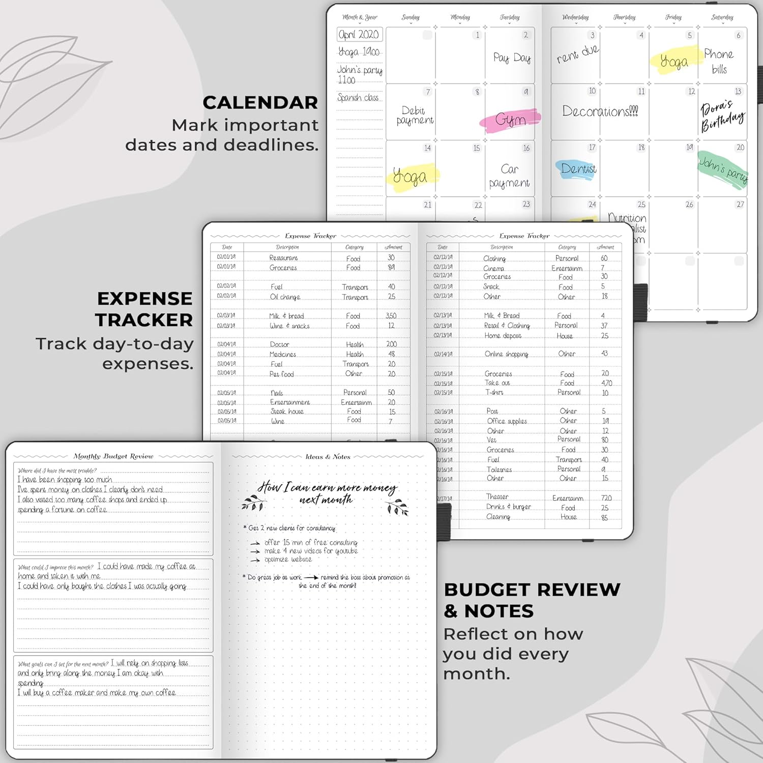 - PERSONAL FINANCE & BUDGETING MADE EASY - Each month, set monthly goals, add reminders of upcoming purchases, bills and payments, make a monthly budget, and track your spending using a dedicated expense tracker.