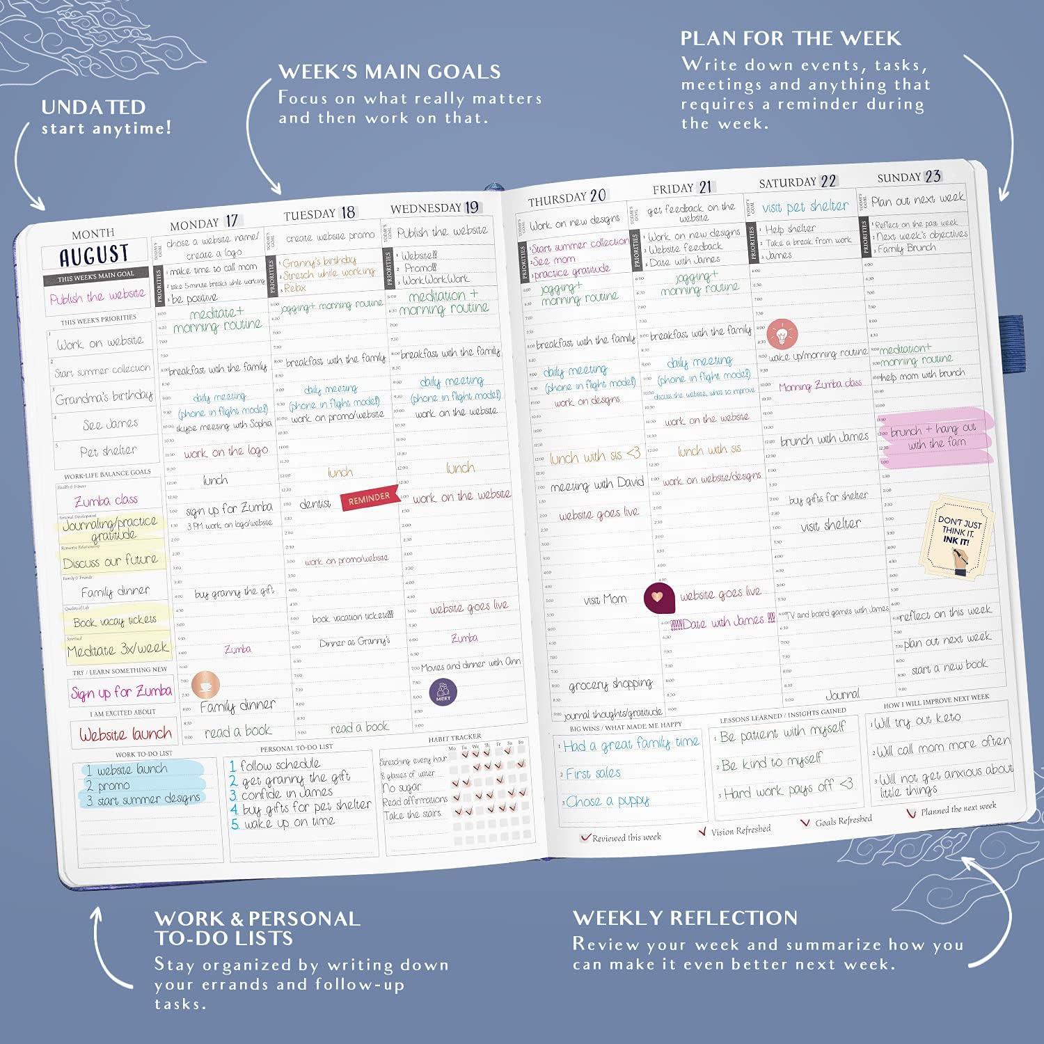 - IMPROVE WORK-LIFE BALANCE, BUILD NEW HABITS & FEEL HAPPIER – This week and day planner is designed to help you build and support a balanced lifestyle, using a daily habit tracker and monthly check-ins.