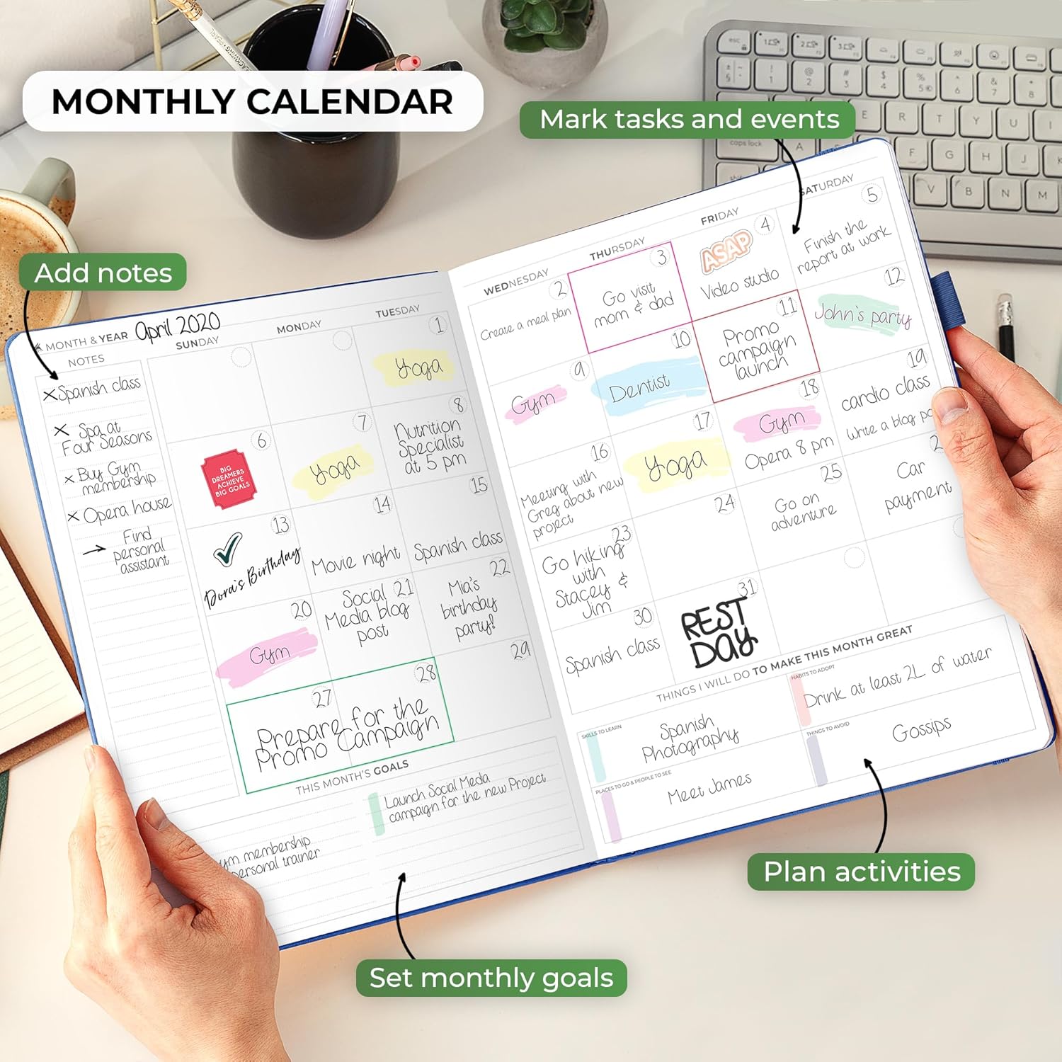 - A4 SIZE & UNDATED LAYOUTS - This calendar organizer is undated, meaning you can start anytime. It has a large A4 format – perfect if you have larger handwriting or like to plan everything in detail.