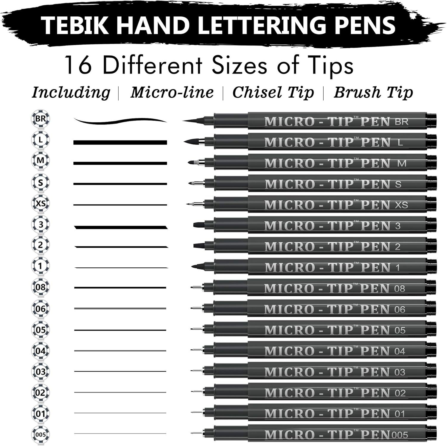 - 16 Pack Calligraphy Pens Set: 16 different sizes of tips of black ink including 005(0.2mm), 01 (0.25mm), 02(0.3mm), 03(0.35 mm), 04(0.4mm), 05(0.45 mm), 06(0.5mm), 08(0.6mm), 1(1.0 mm), 2(2.0 mm), 3(3.0 mm) , XS(Extra fine), S(Fine), 1*M(Medium), 1*L(Large), 1*Br(Brush) for multi use.