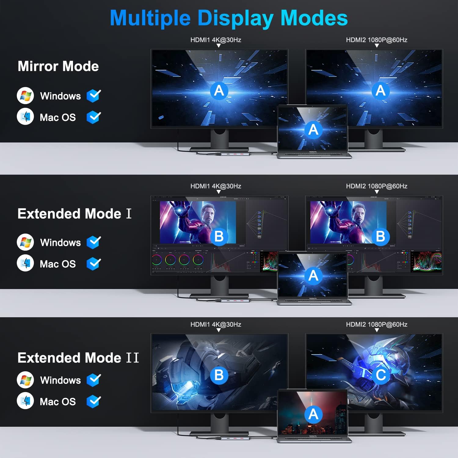 - ăLaptop Docking Station Dual Monitor for MacBookăThe SELORE Docking Station supports mac OS MST, which can convert dual HDMI display to independent work mode. This allows you to work on two separate screens at the same time through this usb c hub, thus increasing productivity and comfort(PLEASE NOTE: The docking station requires a driver to be installed in order to function)