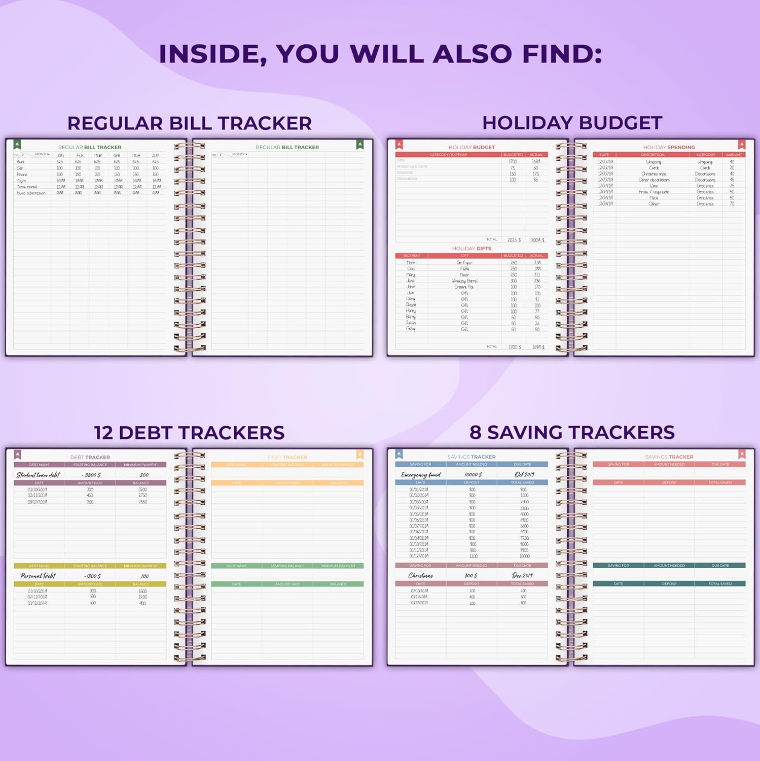 - EASILY CONTROL YOUR SPENDING, DEBTS & SAVINGS – This undated money planner lasts 12 months. The budgeting planner includes monthly budget plans and reviews, expense tracker, 8 saving and 12 debt trackers, bill tracker, holiday budget and check register.