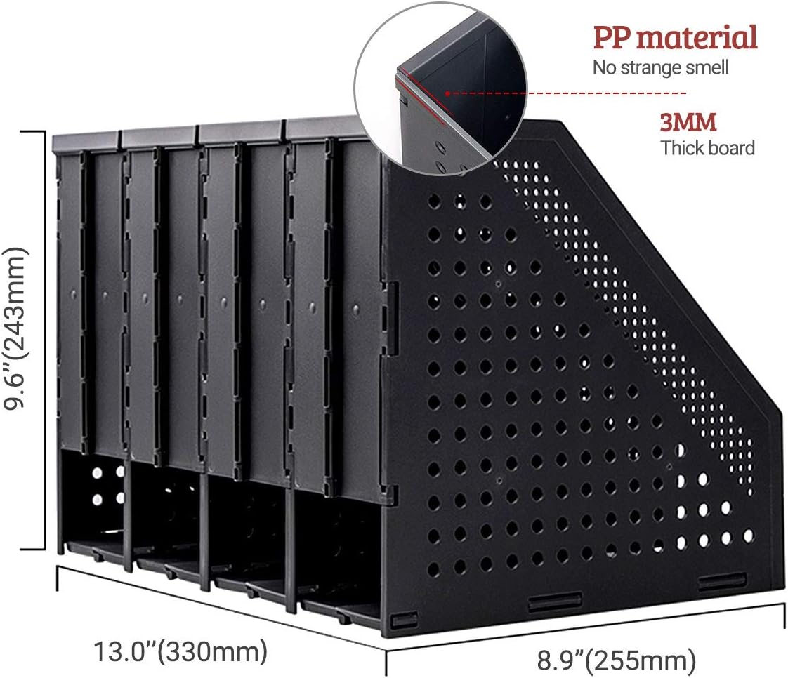 - COLLAPSIBLE MAGAZINE HOLDER: The binder holder organizer with foldable function allows it to flexibly expand or fold according to the size of the space. If you don't have too many files, you can fold the empty compartments to save desktop space.