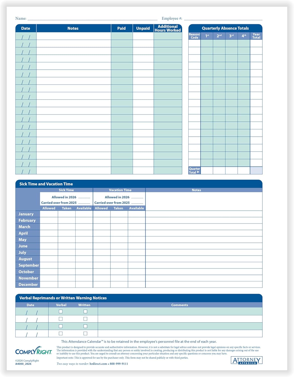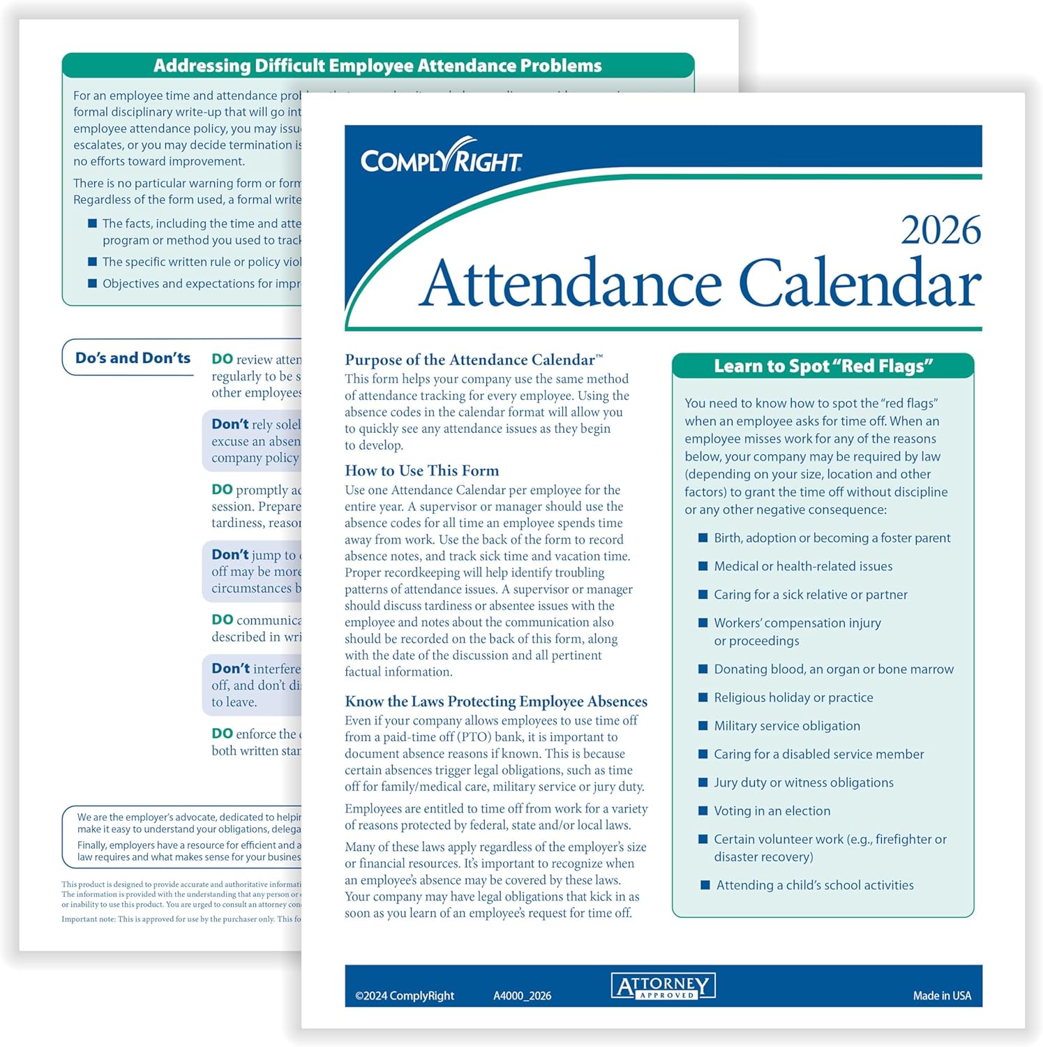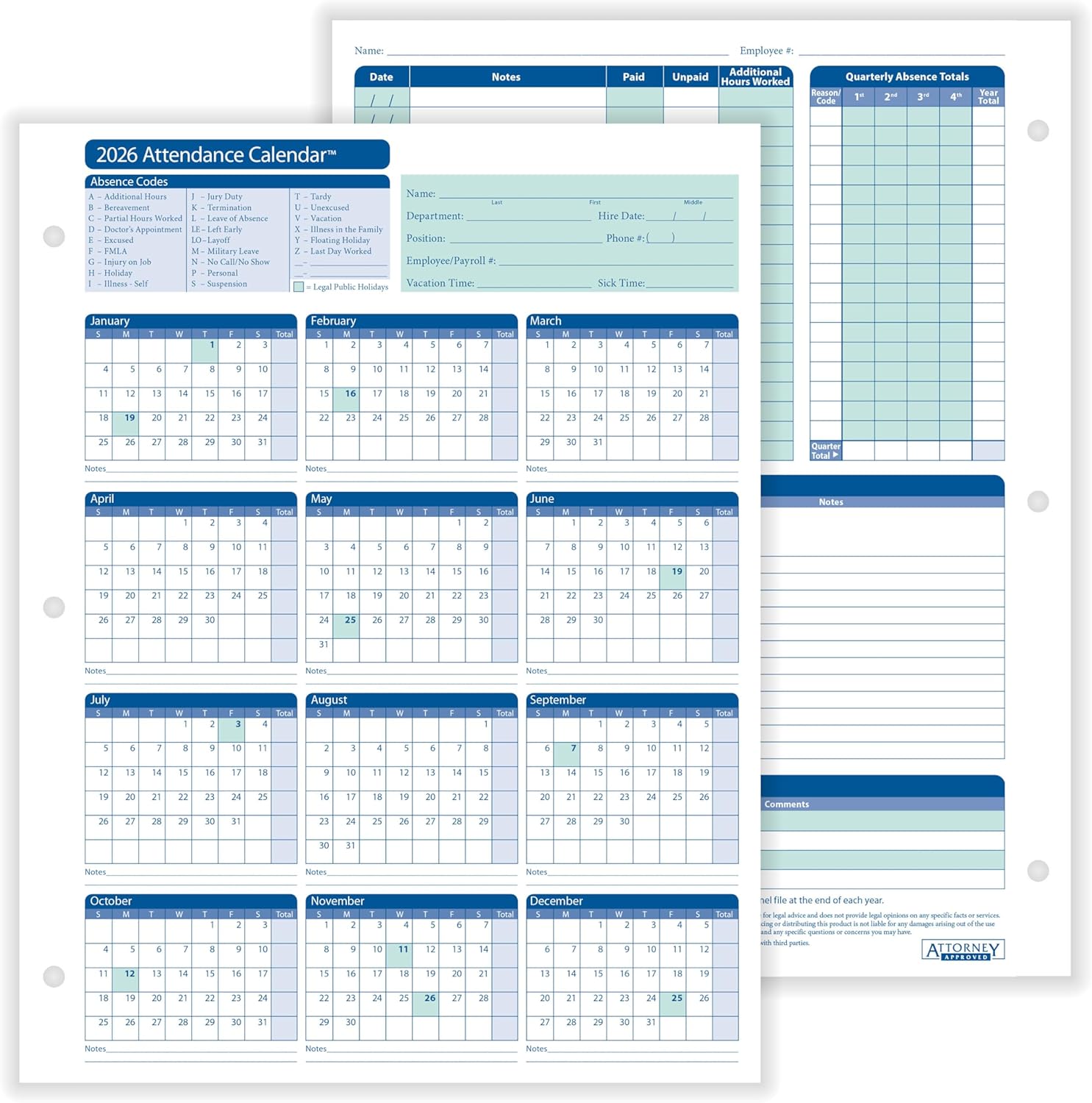 - HR & EMPLOYEE MANAGEMENT: Easily track employee’s attendance record by marking the employees’ absence and documenting other necessary details with the 2026 Attendance Calendar Card. The two-sided forms provide employers with important documentation for performance reviews, unemployment disputes, and tracking leaves.