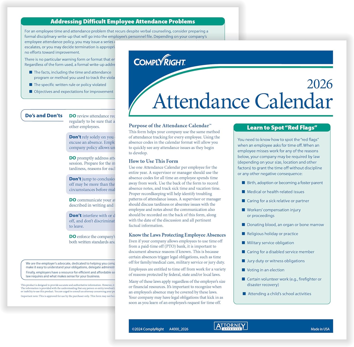 - HR & EMPLOYEE MANAGEMENT: Easily track employee’s attendance record by marking the employees’ absence and documenting other necessary details with the 2026 Attendance Calendar Card. The two-sided forms provide employers with important documentation for performance reviews, unemployment disputes, and tracking leaves.