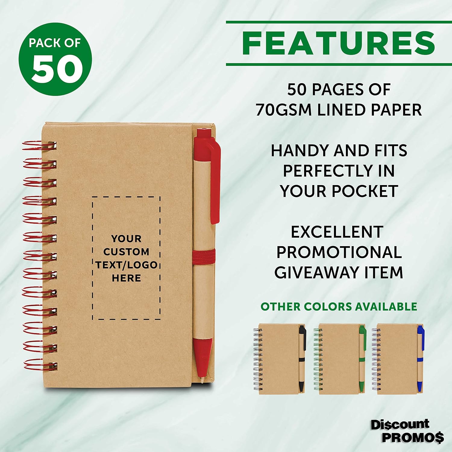 Custom Mini Spiral Notebooks with Black Ink Pens Set of 50, Personalized Bulk Pack - Perfect for School, Office, Business, Home - Red