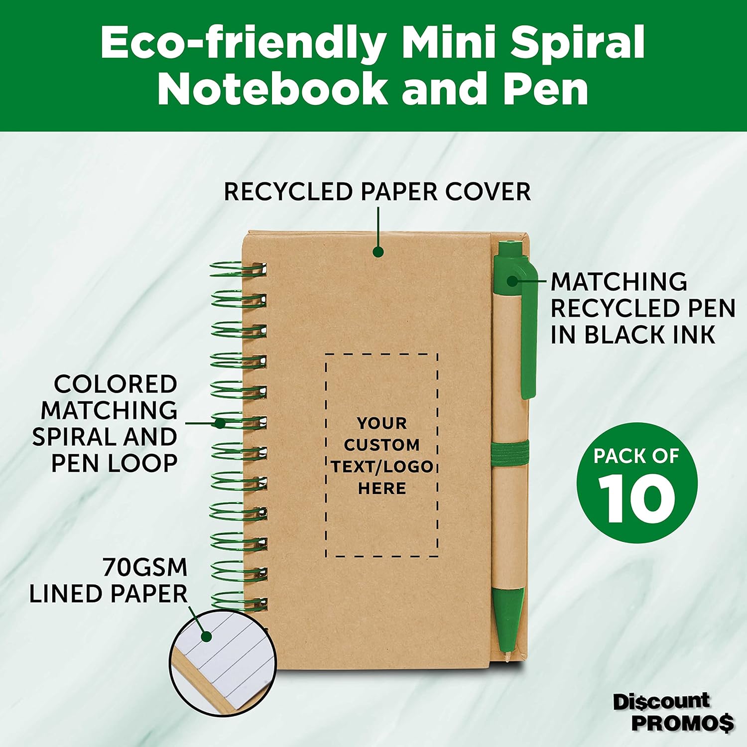 Custom Mini Spiral Notebooks with Black Ink Pens Set of 10, Personalized Bulk Pack - Perfect for School, Office, Business, Home - Green