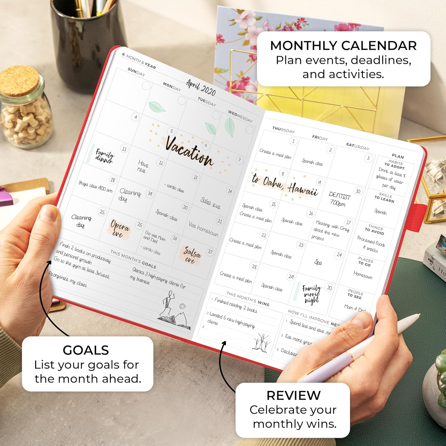 - GOAL-SETTING FRAMEWORK – This planner organizer will help you create a vision for your life, define your long-term life goals, and incorporate these goals into your monthly, weekly, and daily agenda.