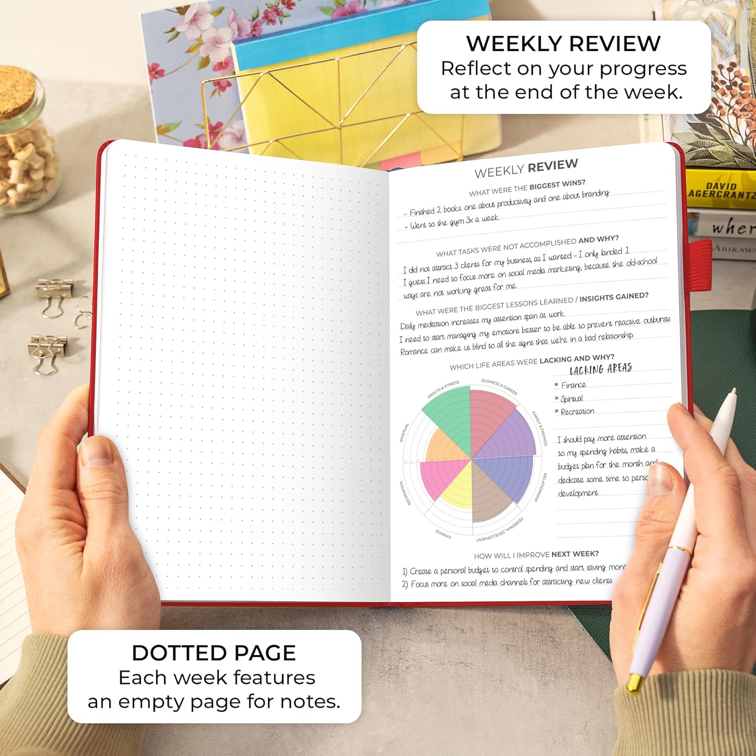 - BEAUTIFUL AND ORIGINAL GIFT – This daily organizer comes in A5 format (14.7 x 21 cm) with a gift box, stickers, user guide, eco-leather hardcover, thick 120gsm paper, pen loop, elastic band, lay-flat binding, and pocket for loose notes.