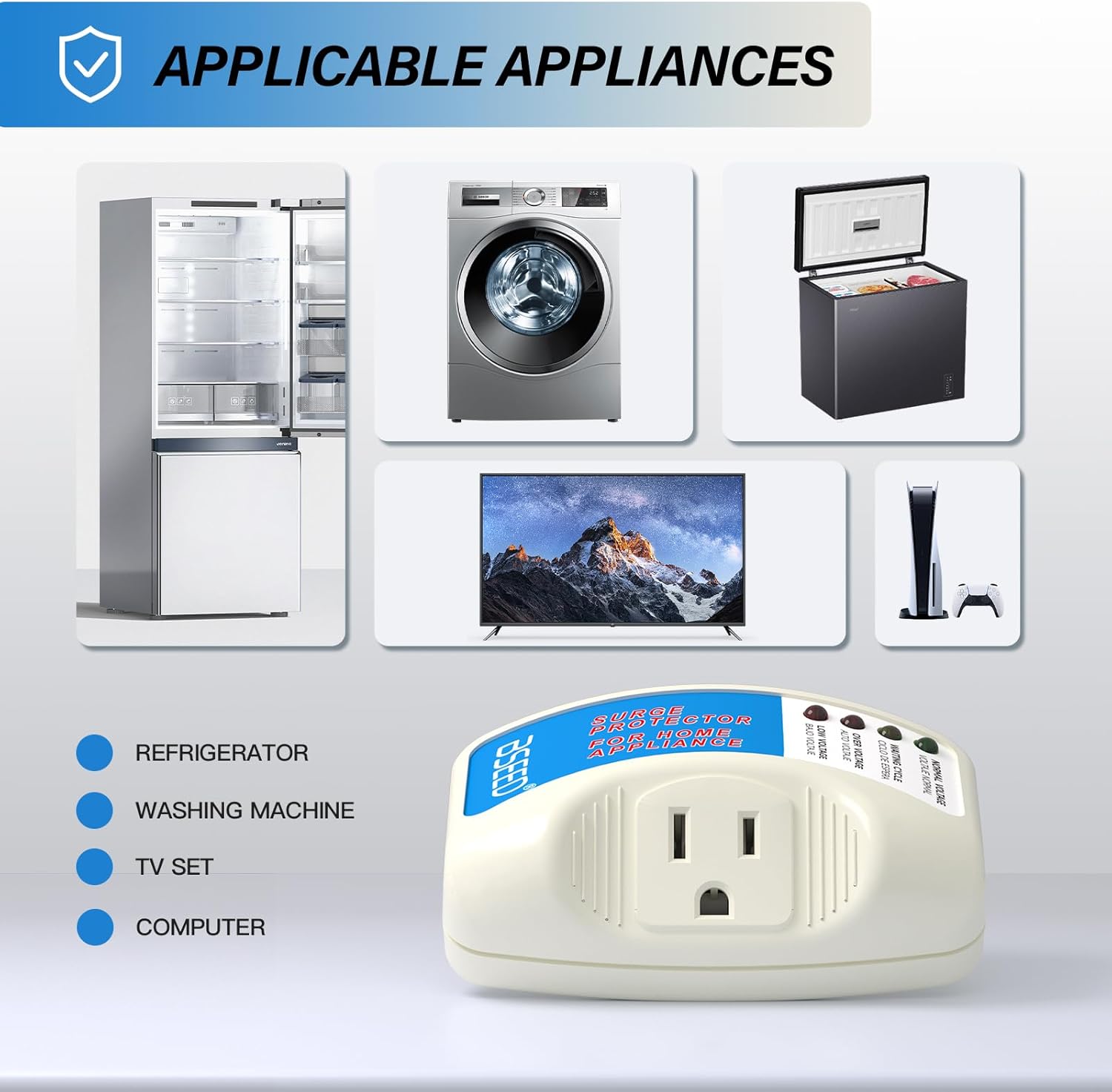 - 3 Mins Period Time: Sometimes multiple voltage surge may occur within one minute. A short-term delay surge protector can cause the refrigerator power cycling quickly, potentially causing significant damage to the compressor. To protect your valuable home appliances, we recommend using BSEED surge protector with a 3-minute delay.
