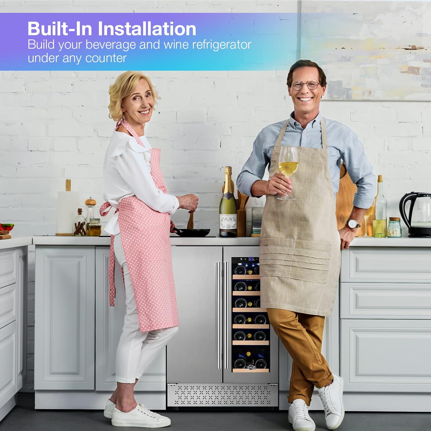 - Built-In or Freestanding Installation:The 24â wide wine and beverage fridge can be installed both under a counter built-in or freestanding;Requires only (H x W x D)34.25 x 23.42 x 22.63 inches of space and can be installed;The built-in installation enables a maximum door opening angle of 180 degrees, and a freestanding style to a maximum of 225 degrees;User-friendly design for you to manage your wine collections or drinks;