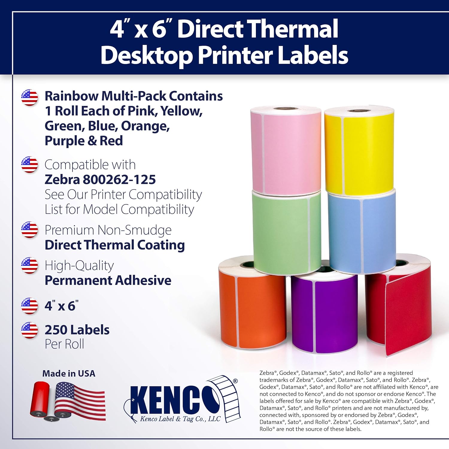- Rainbow Multipack Contains 1 Roll Each of: Red, Orange, Blue, Yellow, Purple, Green, Pink! 4 X 6 Direct Thermal Labels - No Ribbons Needed! 1" Core Provided 250 Labels Per Roll