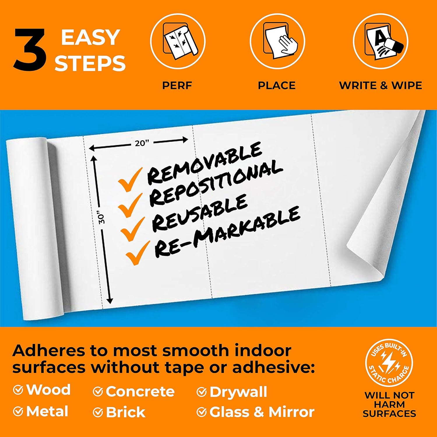 Clingers Dry Erase Cling-rite Roll Basic - Removable, Recyclable Whiteboard, 50' ft Roll, 20x30 Inch Sheets for School, Home, Office Decor, and Art Projects & Dry Erase Marker - American Made
