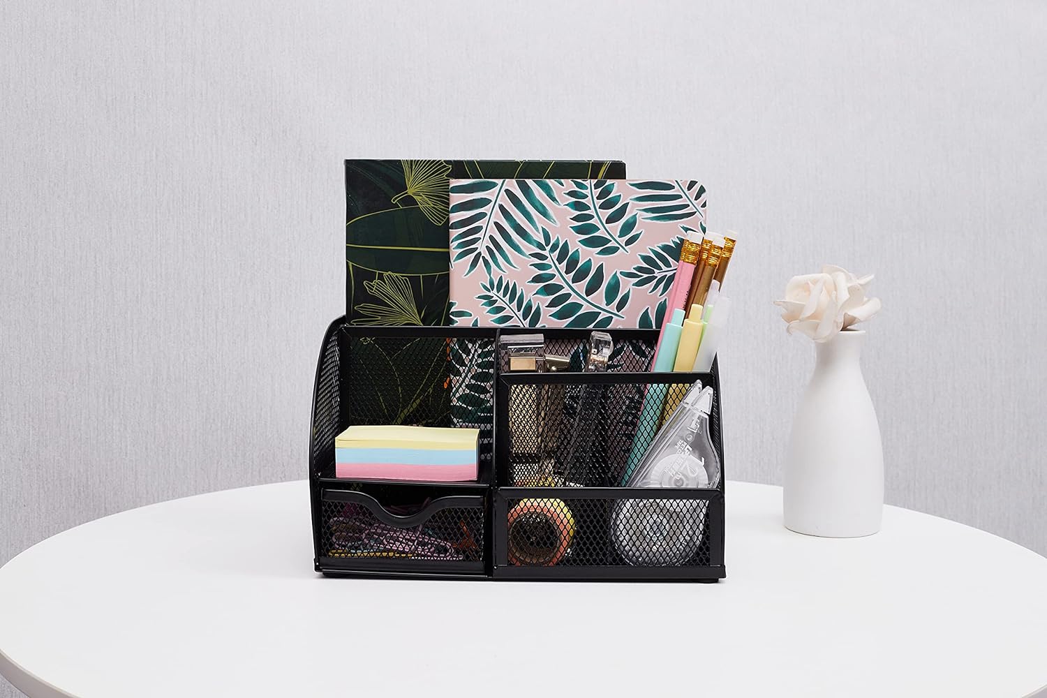 - Keep your desktop tidy and organized with this ANNOVA mesh desktop organizer featuring 7 compartments and one pullout drawer.