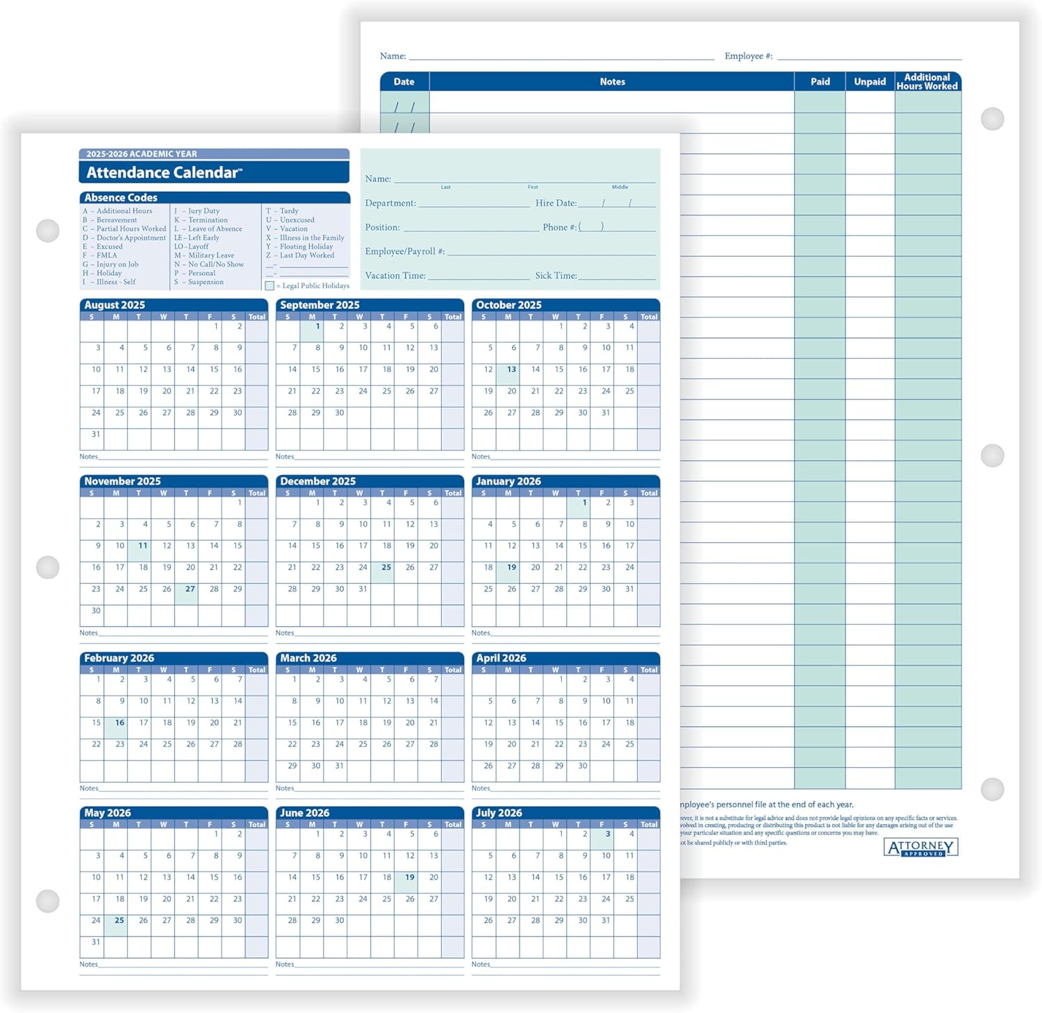 - EMPLOYEE MANAGEMENT: The Academic Year Employee Attendance Calendar makes it easy to keep track of who’s at work and who's repeatedly out for three-day weekends. This allows for school administrations to track absences quickly and conveniently on a daily basis. The date ranges from August 2025 - July 2026, and tracks an entire year of attendance.