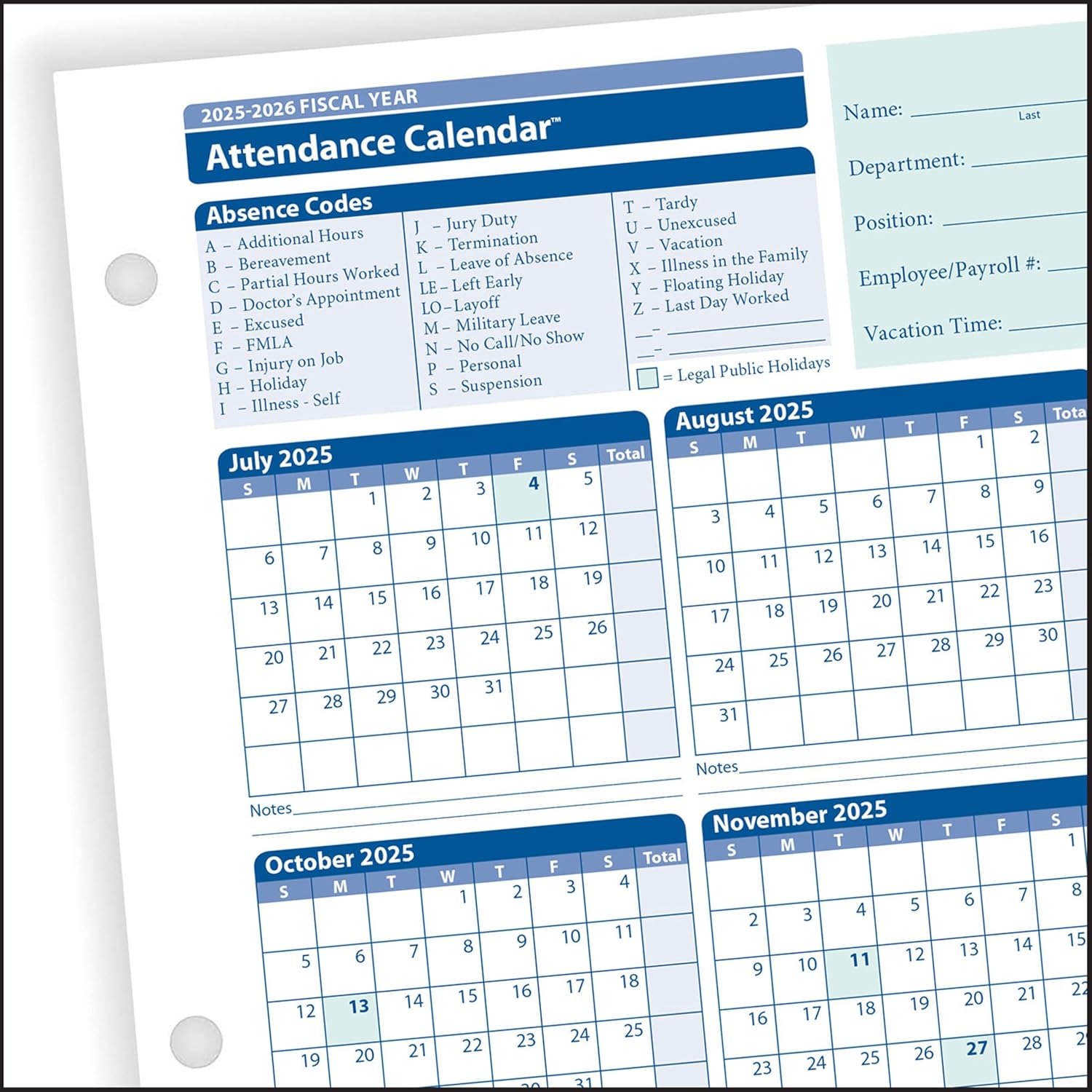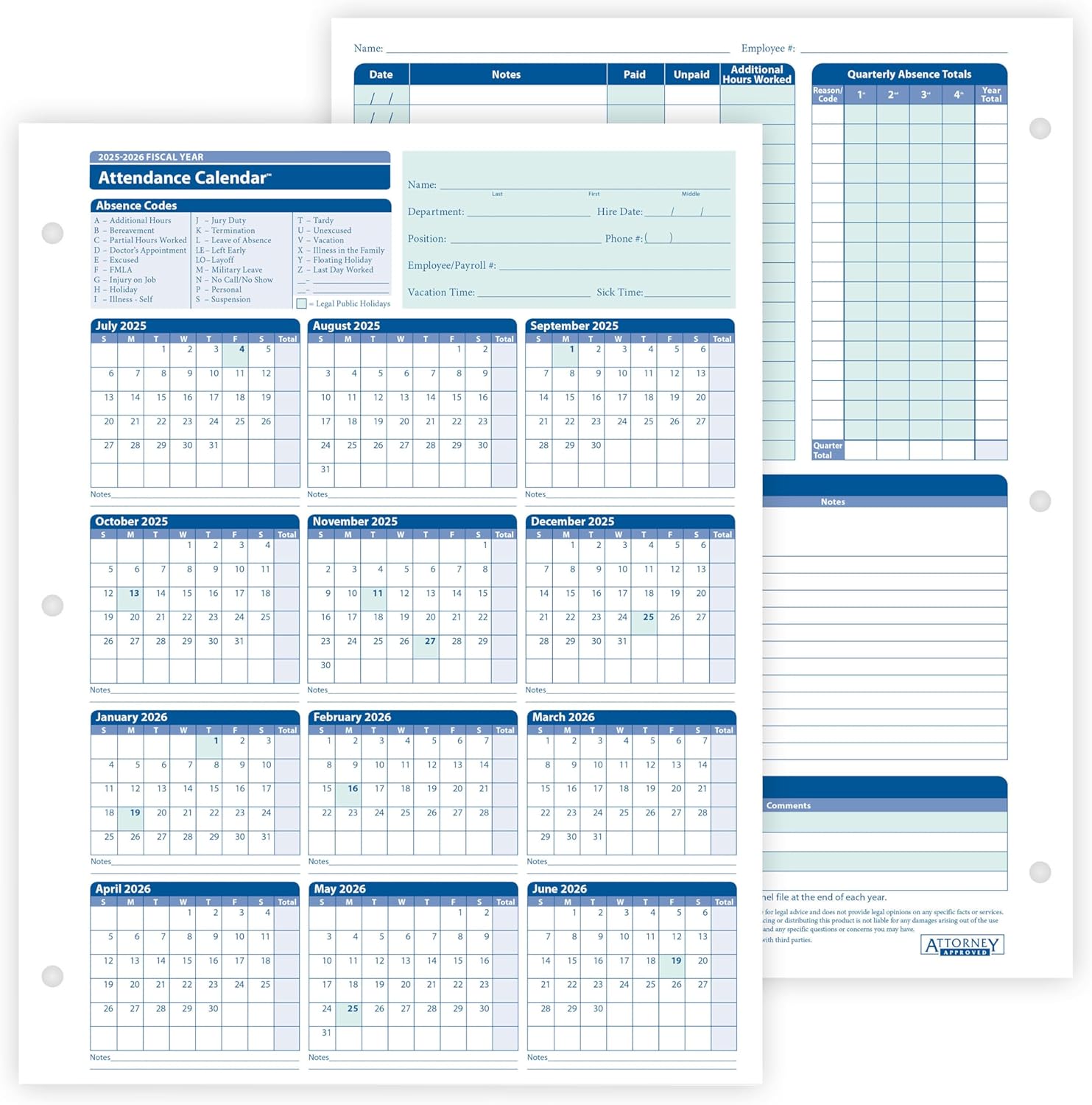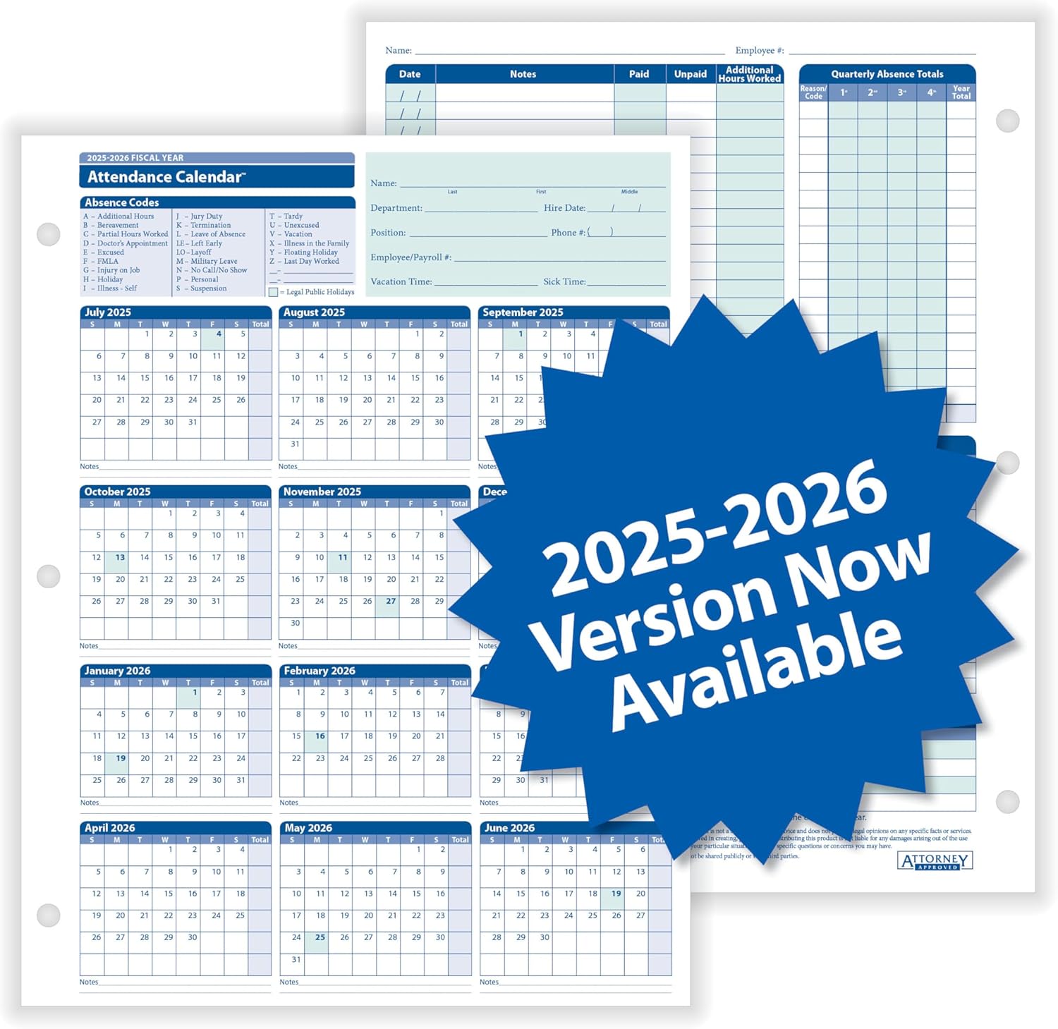 - EMPLOYEE MANAGEMENT: The Fiscal Year Employee Attendance Calendar makes it easy to keep track of who's at work and who's repeatedly out for three-day weekends. This allows businesses to track absences quickly and conveniently on a daily basis. Date ranges from July 2025 - June 2026, recording an entire year of attendance.