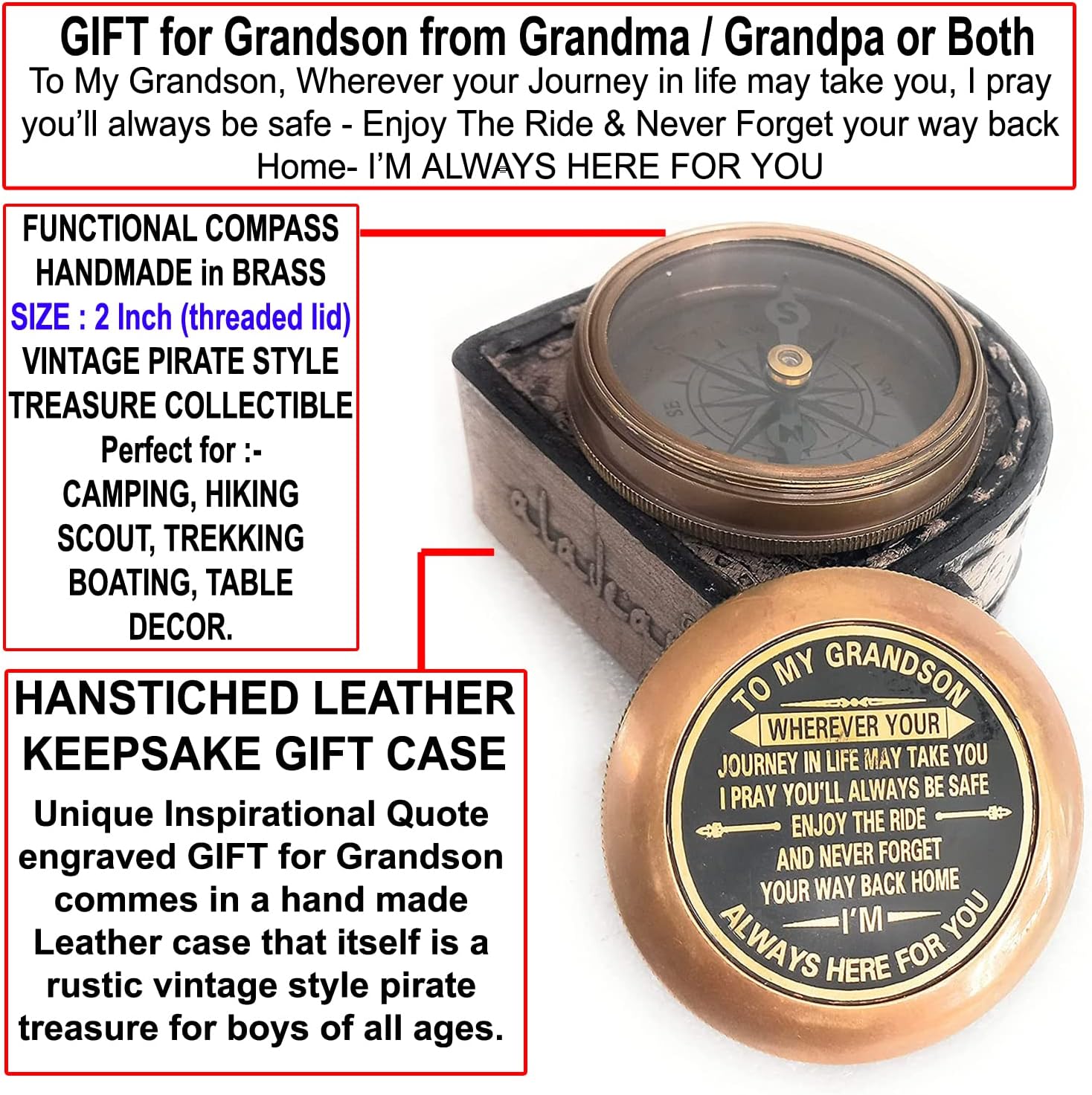 - 1st First Communion Grandson Gift Idea :- Handmade Quote Engraved compass 2 inch (approx.) comes in hand stitched leather case that makes a perfect belt holster. A wonderful gadget to carry along while camping, scout camp, boating, hiking, traveling & riding. Kids would love to learn the lessons of directions with this functional vintage look compass