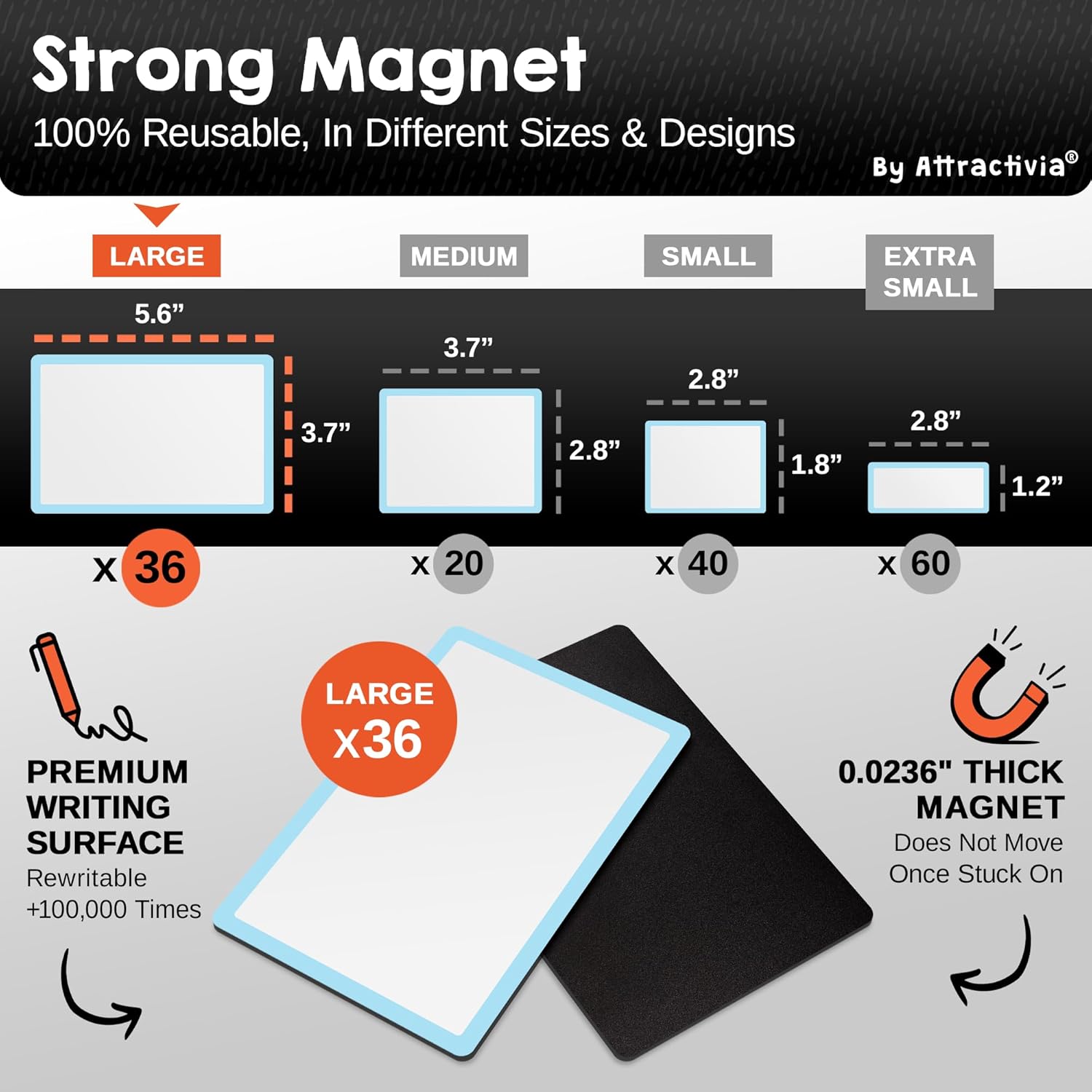 - Strong Magnetic Hold: Our dry erase magnets feature a powerful 0.02 inch thick magnetic back for instant and secure adhesion to any metallic surface, whether flat or slightly curved. Easily attach our dry erase stickers labels and remove without residue, ensuring a firm grip even on rounded surfaces.