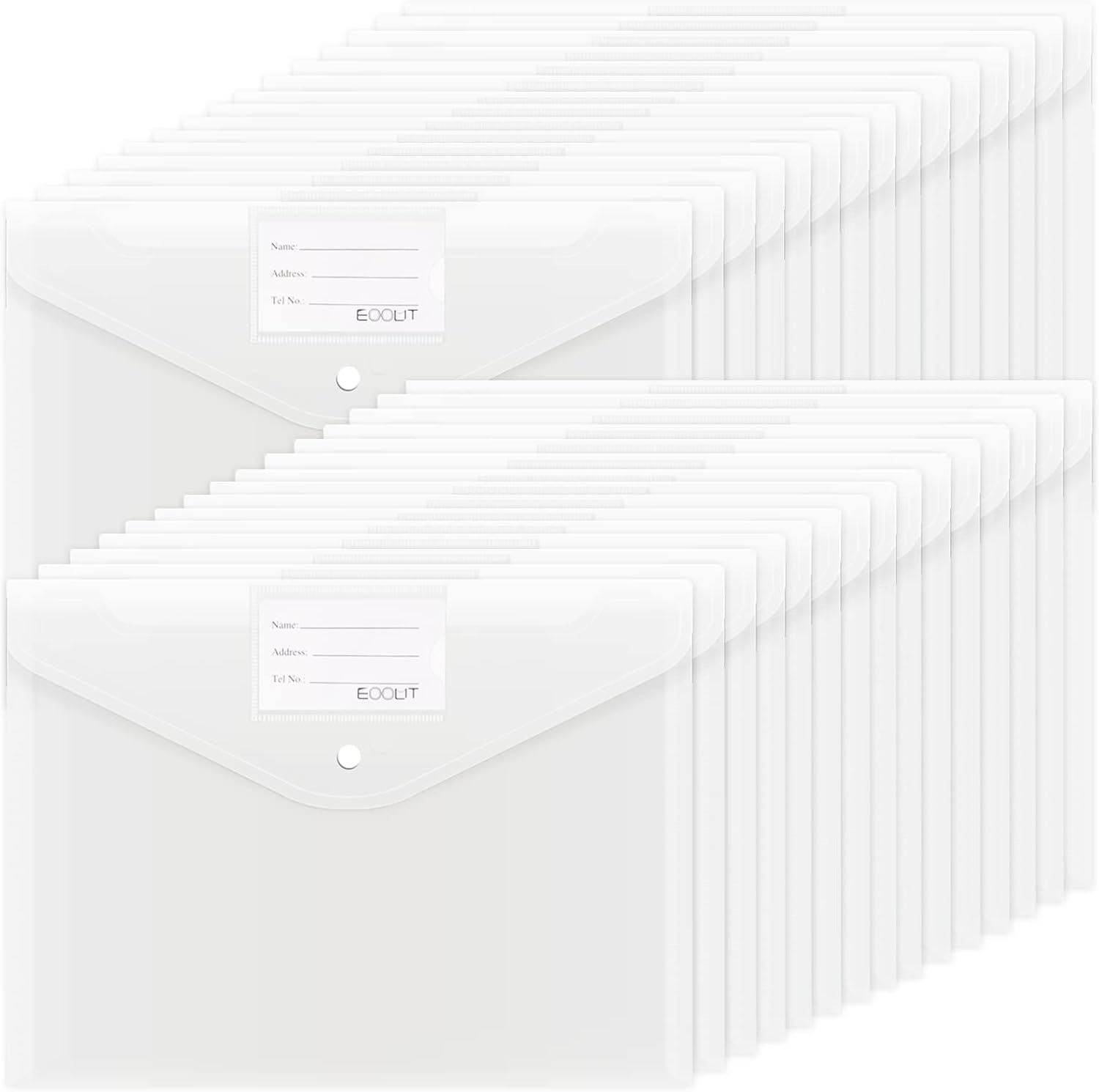 EOOUT 30pcs Plastic Envelopes, Clear Envelopes with Snap Closure, Document Folders Letter Size A4 Size File Envelopes with Label Pocket for School Home Work Office Organization