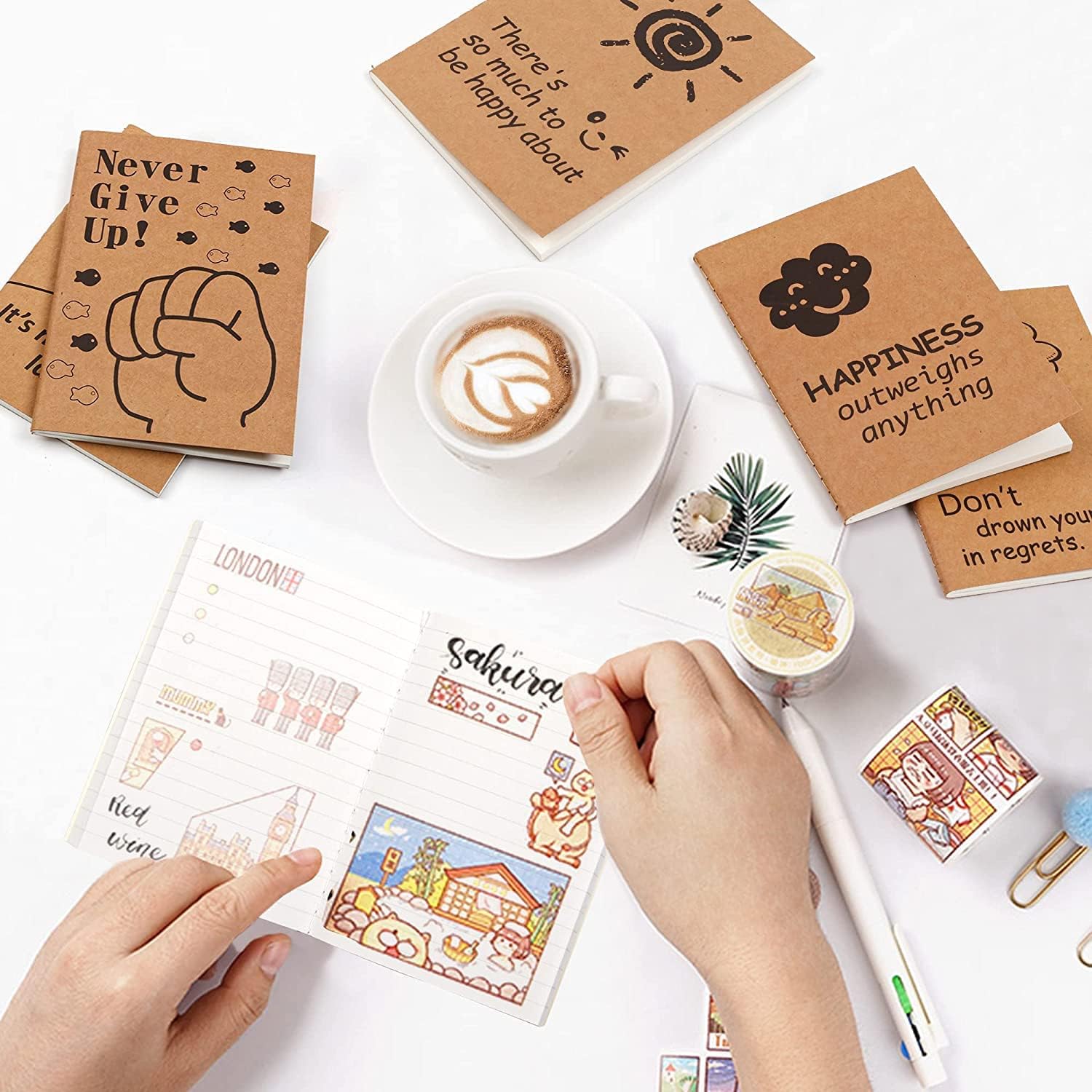 feela 8 Pack Cute Kraft Notebooks, 8 Designs Mini Pocket A6 Notebook Journal Notepad, Lined Small Motivation Blank Journal Bulk for Women Kids Students Gift School Supplies, 4.1X5.8 in, 80 Pages
