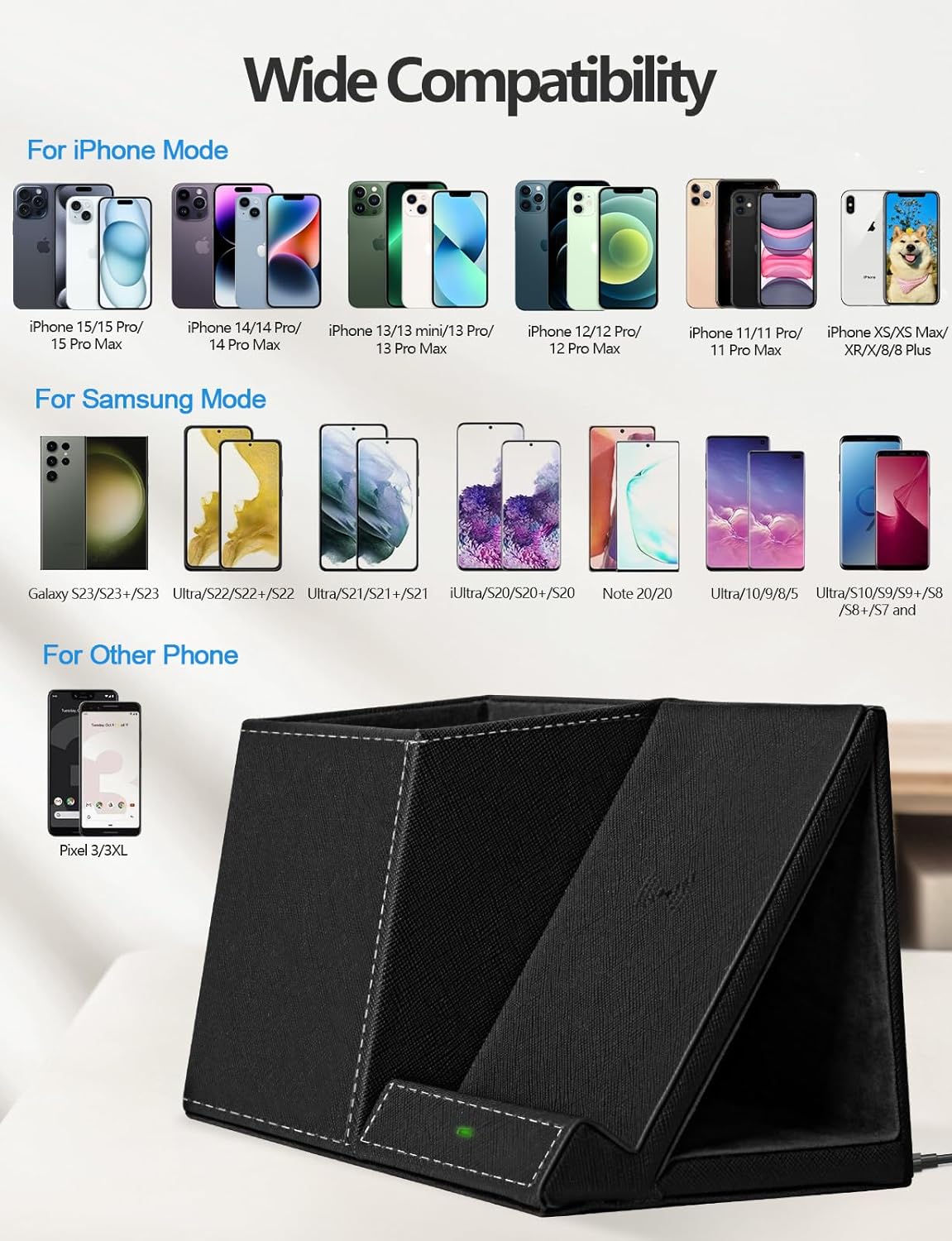 - βββ Universal Compatibility of Wireless Charger: 7.5W fast charging for iPhone 17/16/15/14/14 Plus/14 Pro/14 Pro Max/13/13 Pro/13 Mini/13 Pro Max/12/SE 2020/11/XS/XR/X/8; 10W fast charging compatible for Samsung galaxy S24/S23 Ultra /S23/ S23+/S22 Ultra / S22 / S22+ / S21 Ultra /S21+ / S21/ S20 Ultra / S20/Note 10/S10/S10E and So on; (Note: Adapter is NOT Included)