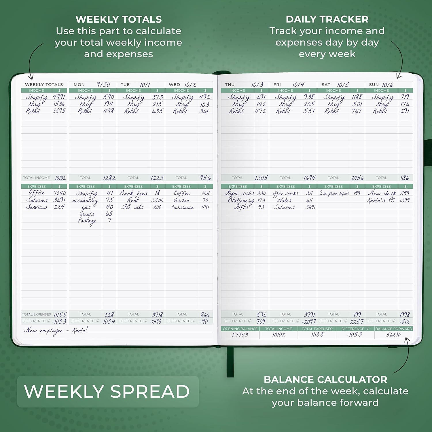 - 2 FULL YEARS OF STRESS-FREE ACCOUNTING: This accounting book is undated and lasts 2 years and has 225 pages, including 106 weekly views, 2 annual summaries, empty note pages, and, at the back, a spacious pocket for receipts.